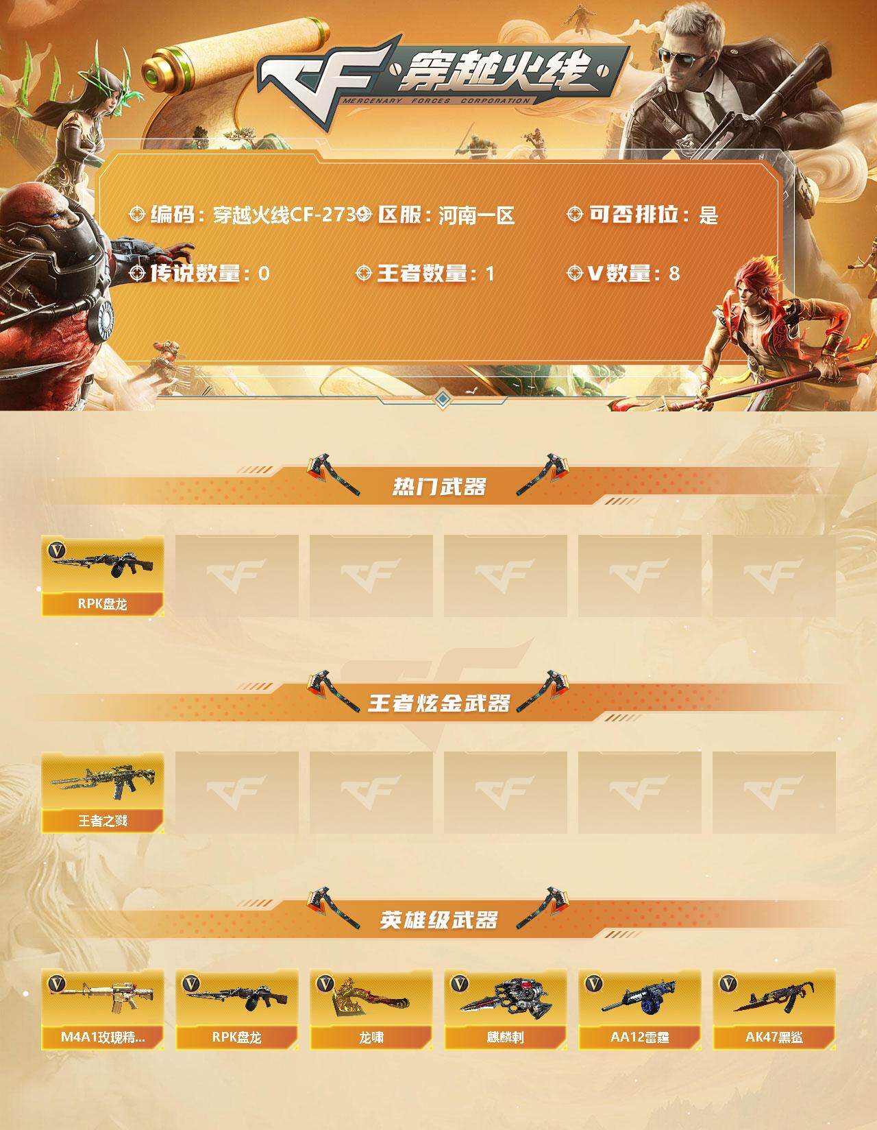 [12308884]【商品标题】:河南一区-8V-1王者-0炫金 【热门武器】:RPK-盘龙 【王者炫金武器】:王者之戮 【英雄级武器】:M4A1-玫瑰精灵,RPK-盘龙,AA-12-雷霆,AK47-黑鲨,麒麟刺,龙啸 【特殊枪械】:1盘龙
