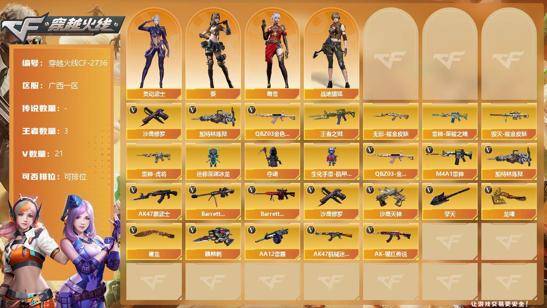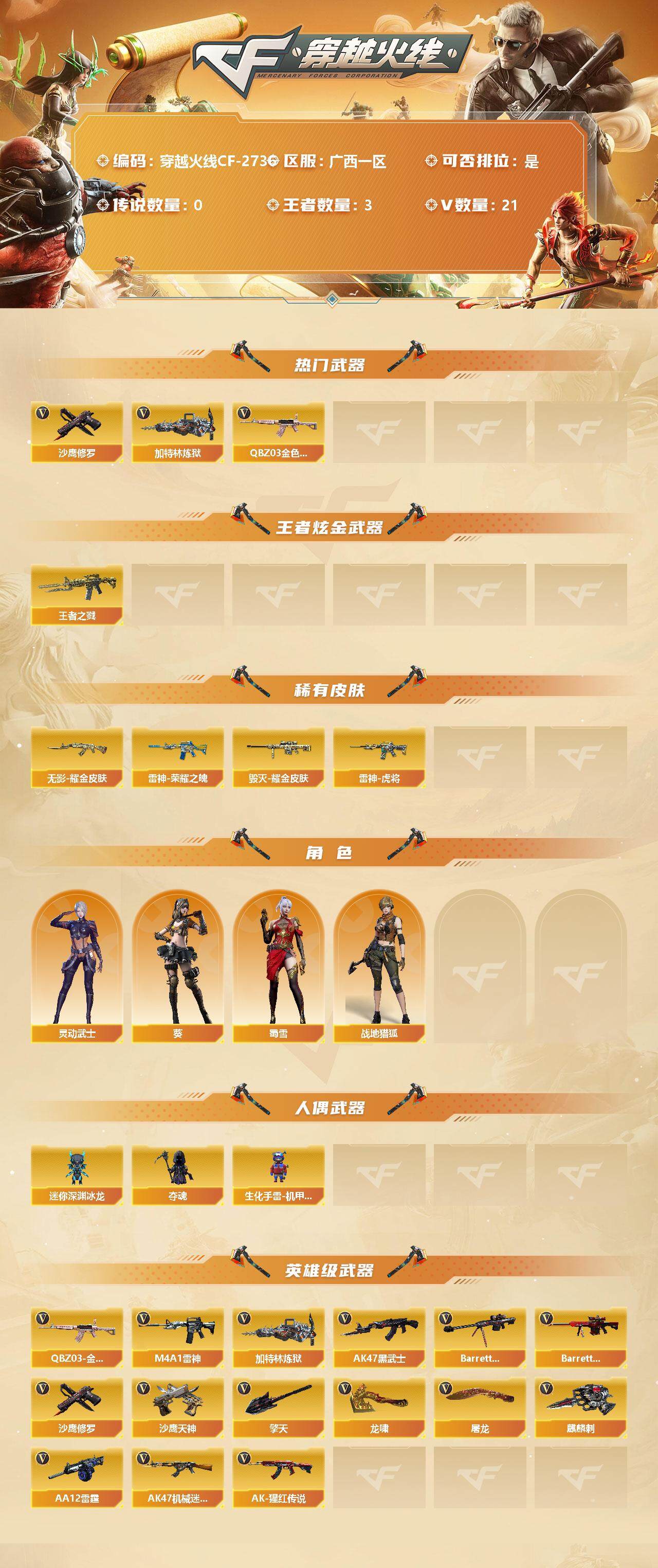 [12308857]【商品标题】:广西一区-21V-3王者-0炫金 【热门武器】:QBZ03-金色蔷薇,加特林-炼狱,沙鹰-修罗 【王者炫金武器】:王者之戮 【稀有皮肤】:雷神-荣耀之魄,雷神-虎将,毁灭耀金皮肤,无影耀金皮肤 【角色】:葵,战地猎狐,蜀雪,灵动武士 【人偶武器】:迷你深渊冰龙,夺魂,生化手雷-机甲核心 【英雄级武器】:QBZ03-金色蔷薇,M4A1-雷神,加特林-炼狱,AK47-黑武士,Barrett-毁灭,Barrett-极光,AK47-机械迷城,AA-12-雷霆,AK-47-猩红传说,沙鹰-天神,沙鹰-修罗,麒麟刺,擎天*2,龙啸,屠龙*2 【特殊枪械】:1炼狱