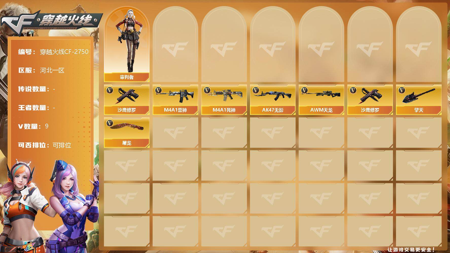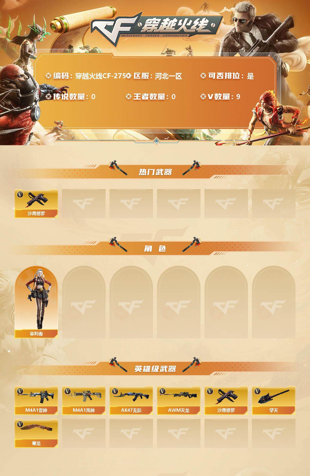 [12308953]【商品标题】:河北一区-9V-0王者-0炫金 【热门武器】:沙鹰-修罗 【角色】:审判者 【英雄级武器】:M4A1-雷神,M4A1-死神,AK47-无影,AWM-天龙,沙鹰-修罗,擎天,屠龙 【特殊枪械】: