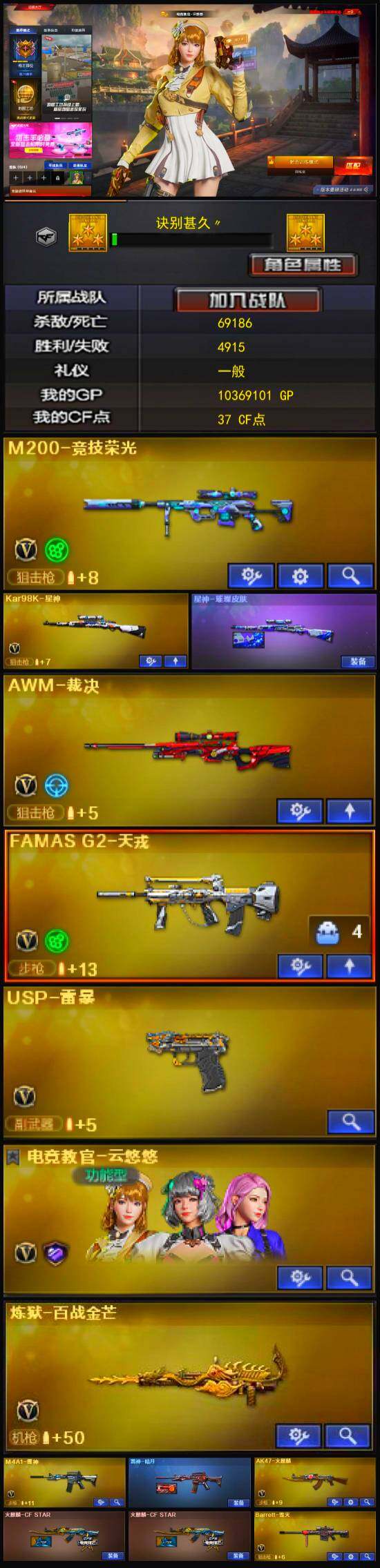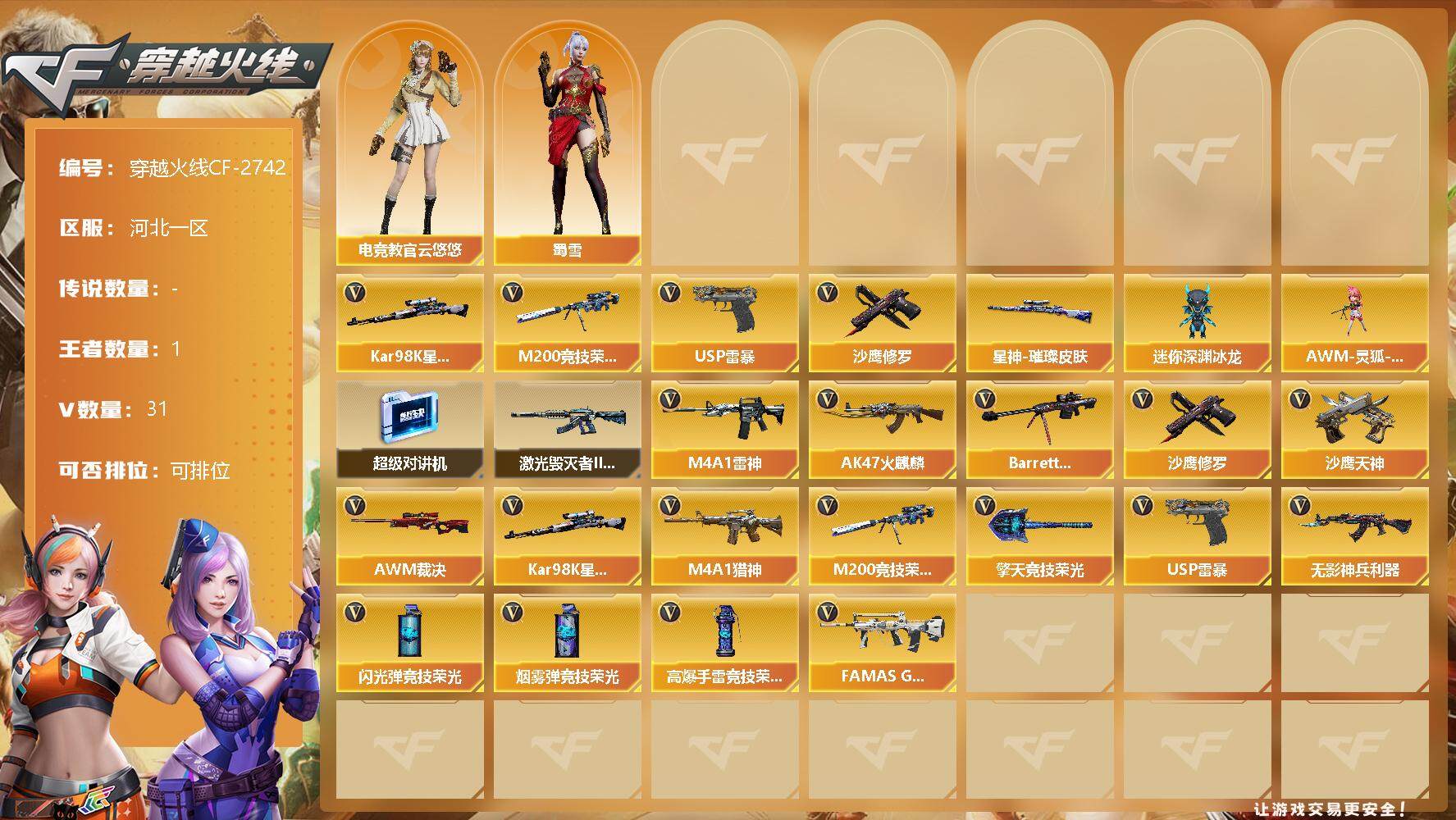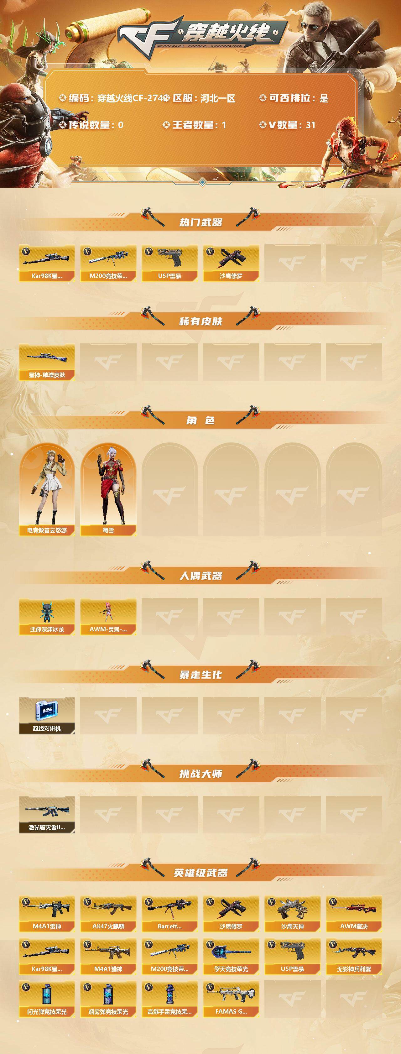 [12308914]【商品标题】:河北一区-31V-1王者-0炫金 【热门武器】:M200-竞技荣光,Kar98K-星神,USP-雷暴,沙鹰-修罗*2 【稀有皮肤】:星神-璀璨皮肤 【角色】:电竞教官-云悠悠,蜀雪 【人偶武器】:AWM-灵狐-15周年嘉年华,迷你深渊冰龙 【暴走生化】:超级对讲机 【挑战大师】:激光毁灭者III-白马银枪*2 【英雄级武器】:M200-竞技荣光,擎天-竞技荣光,高爆手雷-竞技荣光*2,烟雾弹-竞技荣光*3,闪光弹-竞技荣光*3,USP-雷暴,FAMAS G2-天戎,无影-神兵利器,M4A1-雷神,AK47-火麒麟,Barrett-毁灭,AWM-裁决,Kar98K-星神,M4A1-猎神,沙鹰-天神*3,沙鹰-修罗*2 【特殊枪械】: