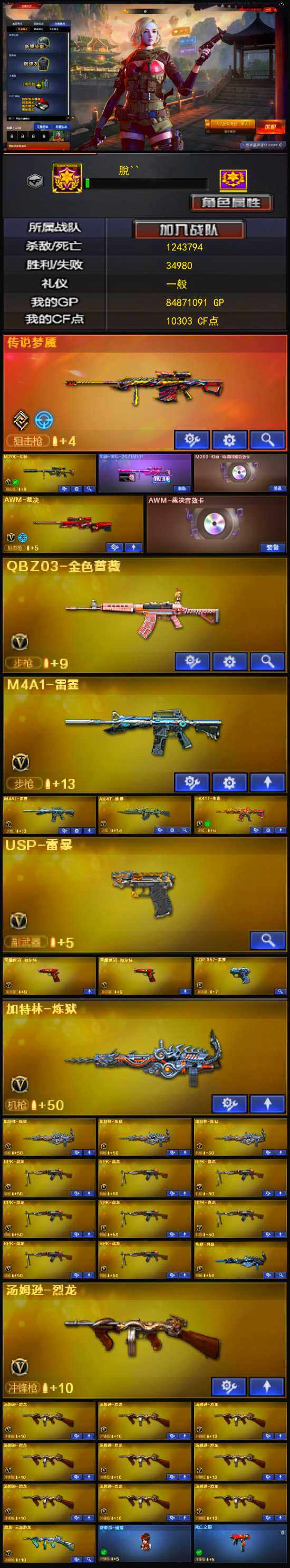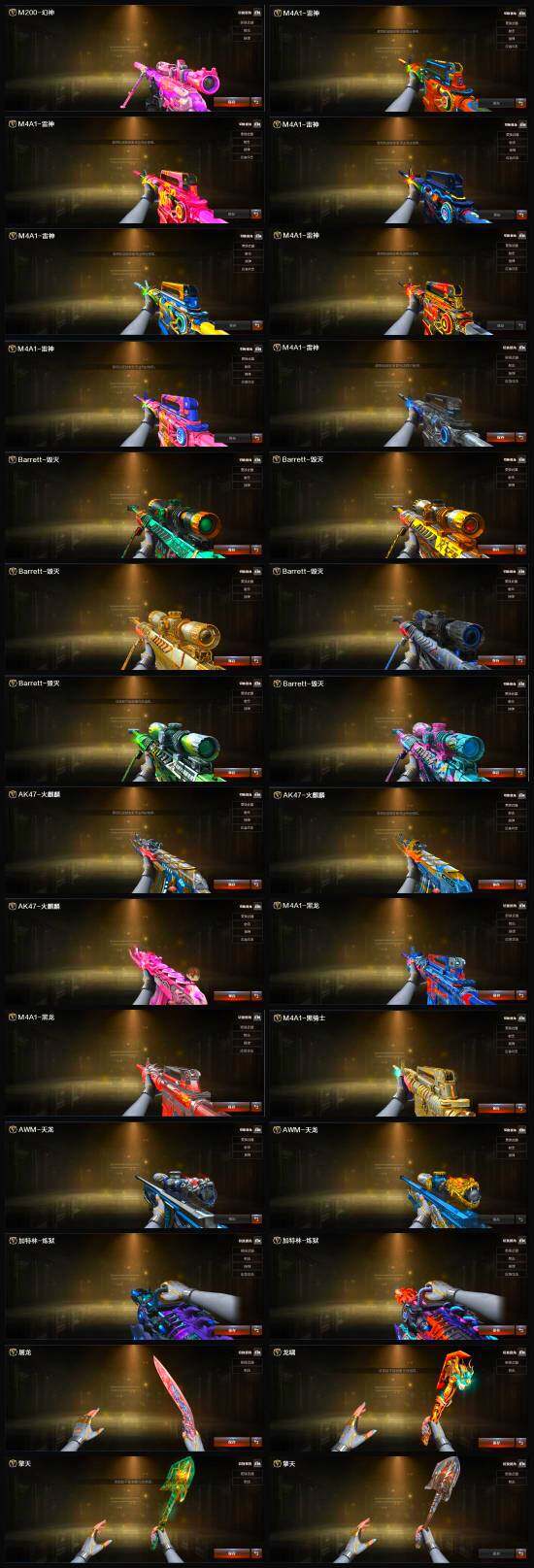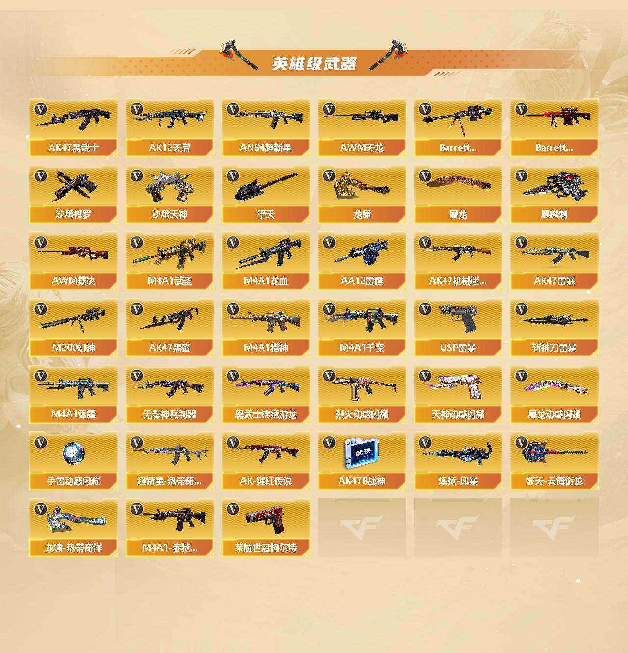 【英雄级武器】:AK47-雷暴,USP-雷暴,斩神刀-雷暴,M4A1-雷霆*2,M4A1-武圣,荣耀世冠-柯尔特*2,烈火-动感闪耀,天神-动感闪耀,屠龙-动感闪耀,手雷-动感闪耀,QBZ03-金色蔷薇,HK417-朱雀,无影-神兵利器,M4A1-雷神*5,M4A1-黑龙*9,M4A1-玫瑰精灵*3,M4A1-黑骑士*7,M4A1-死神*2,RPK-盘龙*8,加特林-炼狱*4,汤姆逊-烈龙*10,AK47-无影,AK47-火麒麟*2,AK47-黑武士,AK12-天启,AN94-超新星,AWM-天龙*2,Barrett-毁灭*4,Barrett-极光*3,AWM-裁决,M4A1-龙血*7,AK47-机械迷城*2,AA-12-雷霆,M200-幻神,AK