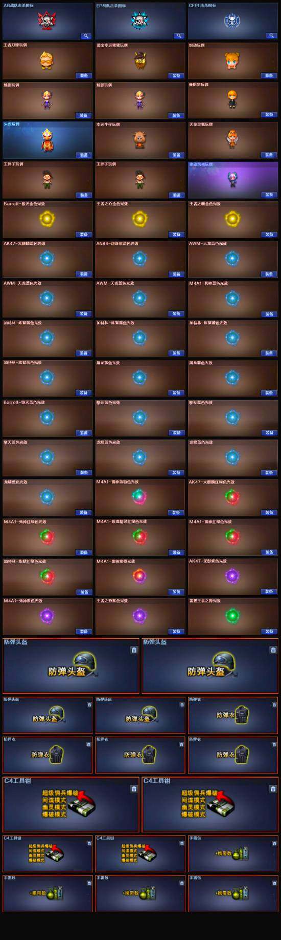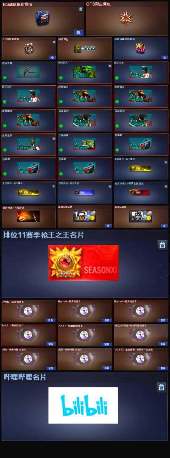 【音效卡】:屠龙-动感闪耀 音效卡,烈火-动感闪耀 音效卡,QBZ03-金色蔷薇-热带奇洋音效卡,AK47-火麒麟音效卡,M4A1-雷神音效卡,Barrett-毁灭音效卡*2,Barrett-毁灭-云海游龙音效卡,AWM-裁决音效卡