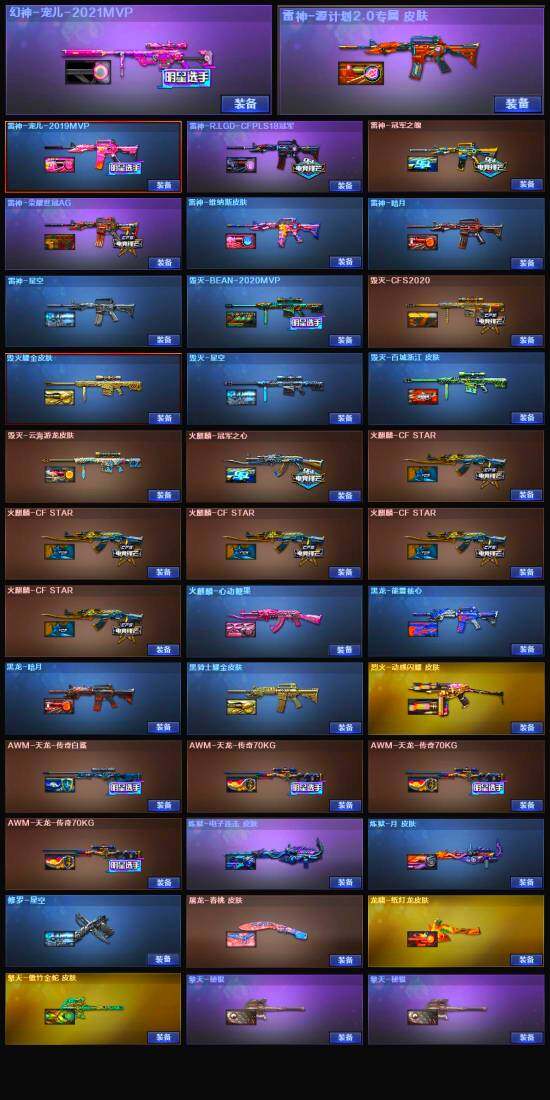 【稀有皮肤】:幻神-宠儿-2021MVP,雷神-星空,雷神-冠军之魄,雷神-宠儿-2019MVP,雷神-R.LGD-CFPLS18冠军,雷神-荣耀世冠AG,火麒麟-冠军之心,火麒麟-心动糖果,毁灭耀金皮肤,毁灭-星空,毁灭-CFS2020,毁灭-BEAN-2020MVP,AWM-天龙-传奇70KG*3,AWM-天龙-传奇白鲨,修罗-星空,屠龙-春桃 皮肤,龙啸-纸灯龙皮肤