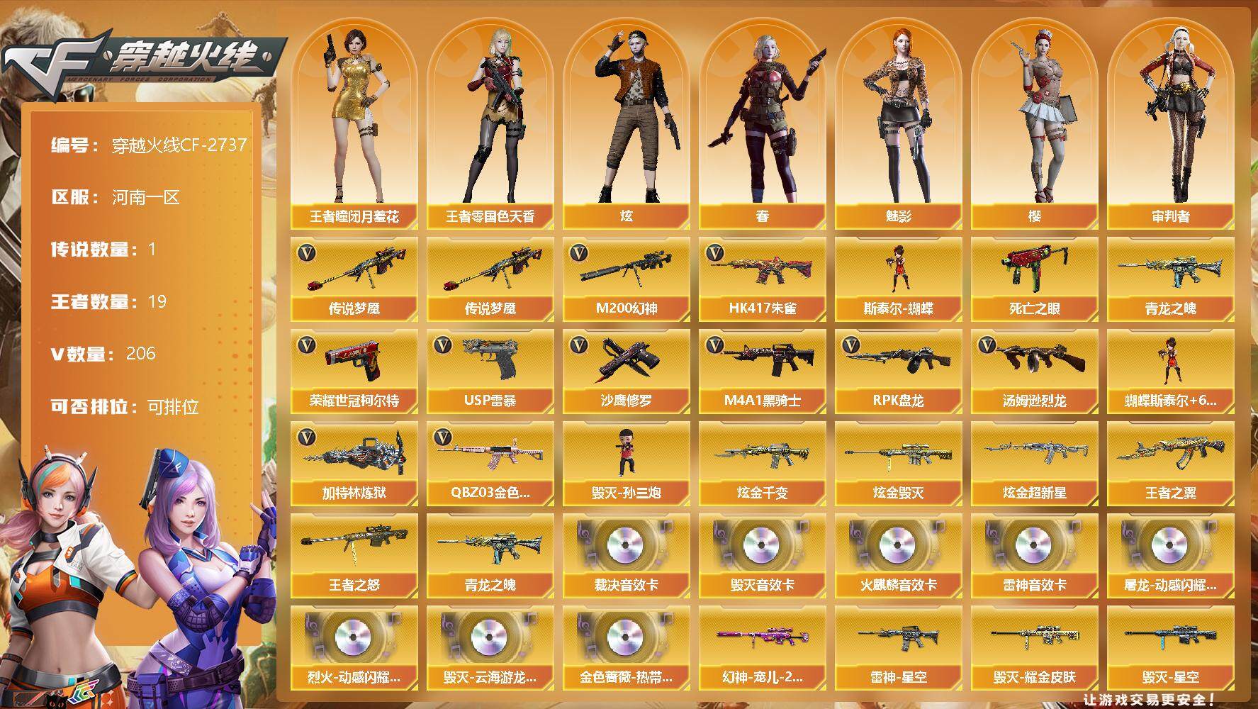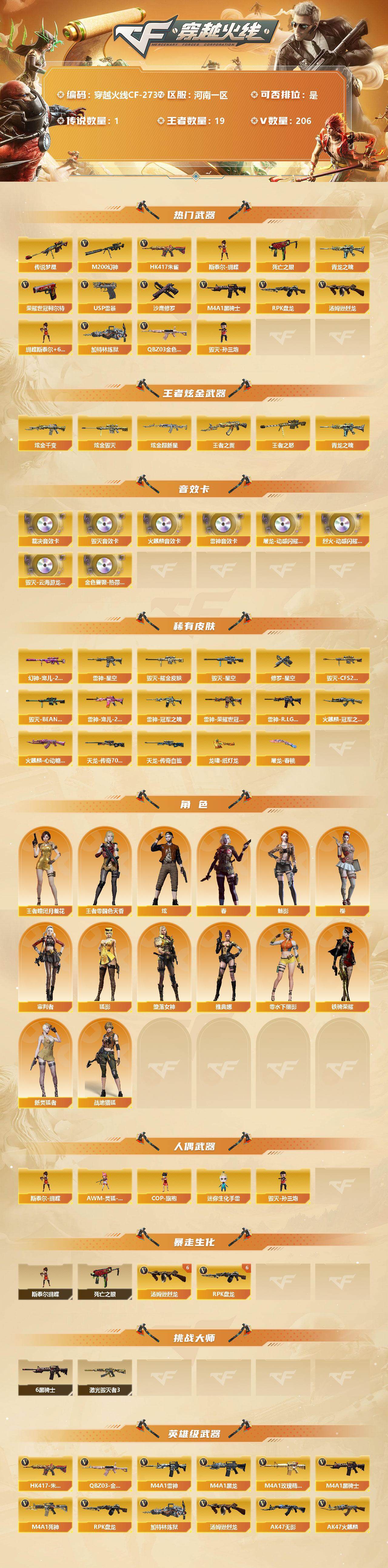 [12308867]【商品标题】:河南一区-206V-19王者-5炫金 【传说武器】:传说梦魇 【热门武器】:传说梦魇,QBZ03-金色蔷薇,HK417-朱雀,M200-幻神,死亡之眼,青龙之魄,荣耀世冠-柯尔特*2,M4A1-黑骑士*7,汤姆逊-烈龙*10,RPK-盘龙*8,加特林-炼狱*4,斯泰尔-蝴蝶,毁灭-孙三炮,USP-雷暴,沙鹰-修罗*7 【王者炫金武器】:炫金千变,炫金毁灭*3,炫金超新星,王者之翼,王者之怒,青龙之魄 【音效卡】:屠龙-动感闪耀 音效卡,烈火-动感闪耀 音效卡,QBZ03-金色蔷薇-热带奇洋音效卡,AK47-火麒麟音效卡,M4A1-雷神音效卡,Barrett-毁灭音效卡*2,Barrett-毁灭-云海游龙音效卡,AWM-裁决音效卡 【稀有皮肤】:幻神-宠儿-2021MVP,雷神-星空,雷神-冠军之魄,雷神-宠儿-2019MVP,雷神-R.LGD-CFPLS18冠军,雷神-荣耀世冠AG,火麒麟-冠军之心,火麒麟-心动糖果,毁灭耀金皮肤,毁灭-星空,毁灭-CFS2020,毁灭-BEAN-2020MVP,AWM-天龙-传奇70KG*3,AWM-天龙-传奇白鲨,修罗-星空,屠龙-春桃 皮肤,龙啸-纸灯龙皮肤 【角色】:王者-瞳-闭月羞花,王者-零-国色天香,雅典娜,堕落女神,狐影,零-水下丽影,审判者,樱,魅影,炫,春,战地猎狐,新灵狐者,铁骑荣耀 【人偶武器】:毁灭-孙三炮,斯泰尔-蝴蝶,AWM-灵狐-15周年嘉年华,COP-旗袍,迷你生化手雷 【暴走生化】:斯泰尔-蝴蝶,死亡之眼 【挑战大师】:激光毁灭者III 【英雄级武器】:AK47-雷暴,USP-雷暴,斩神刀-雷暴,M4A1-雷霆*2,M4A1-武圣,荣耀世冠-柯尔特*2,烈火-动感闪耀,天神-动感闪耀,屠龙-动感闪耀,手雷-动感闪耀,QBZ03-金色蔷薇,HK417-朱雀,无影-神兵利器,M4A1-雷神*5,M4A1-黑龙*9,M4A1-玫瑰精灵*3,M4A1-黑骑士*7,M4A1-死神*2,RPK-盘龙*8,加特林-炼狱*4,汤姆逊-烈龙*10,AK47-无影,AK47-火麒麟*2,AK47-黑武士,AK12-天启,AN94-超新星,AWM-天龙*2,Barrett-毁灭*4,Barrett-极光*3,AWM-裁决,M4A1-龙血*7,AK47-机械迷城*2,AA-12-雷霆,M200-幻神,AK