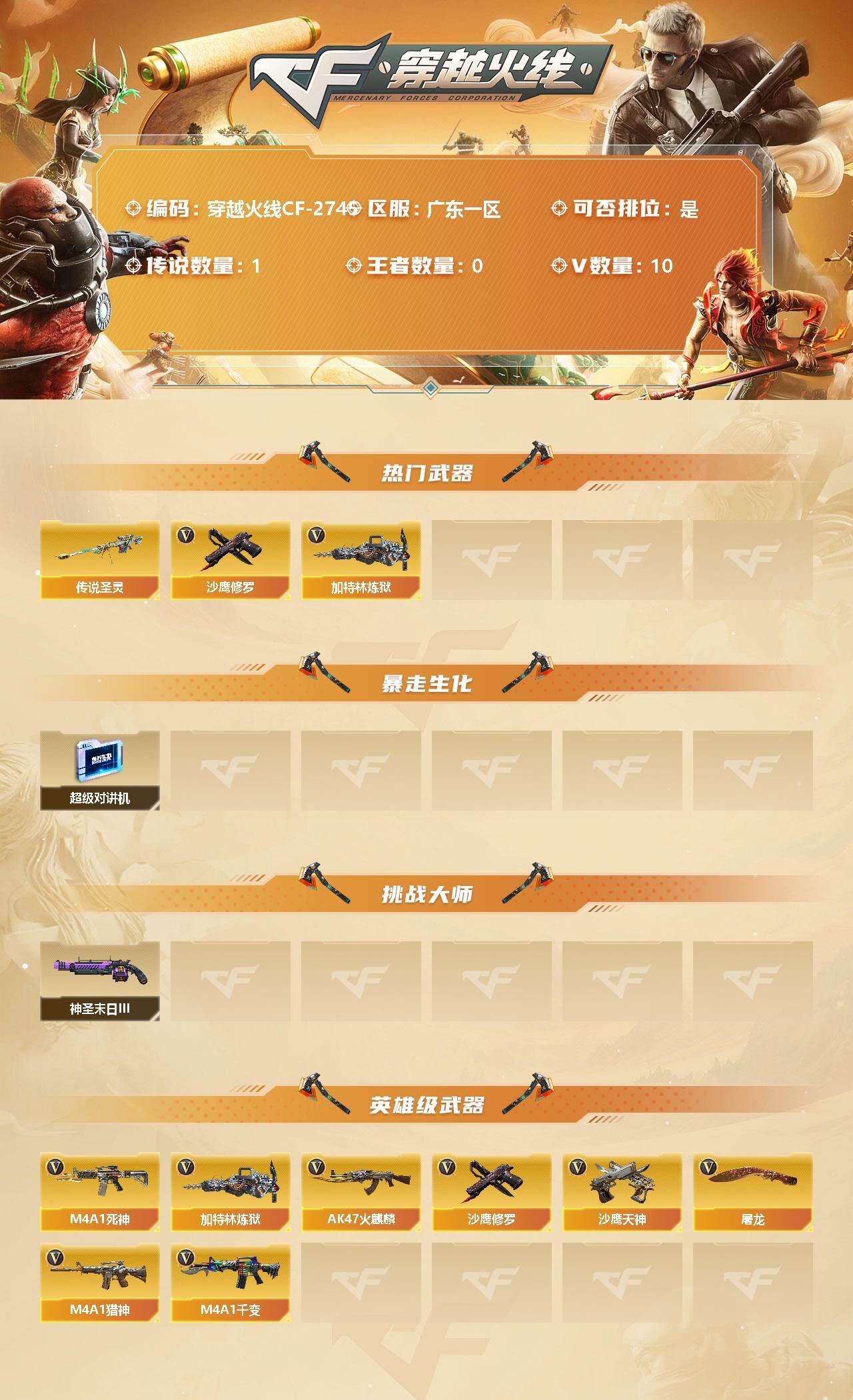 [12308927]【商品标题】:广东一区-10V-0王者-0炫金 【传说武器】:传说圣灵 【热门武器】:传说圣灵,加特林-炼狱,沙鹰-修罗 【暴走生化】:超级对讲机 【挑战大师】:神圣爆裂者-末日III 【英雄级武器】:M4A1-死神,加特林-炼狱,AK47-火麒麟,M4A1-猎神,M4A1-千变,沙鹰-天神,沙鹰-修罗,屠龙 【特殊枪械】:1炼狱