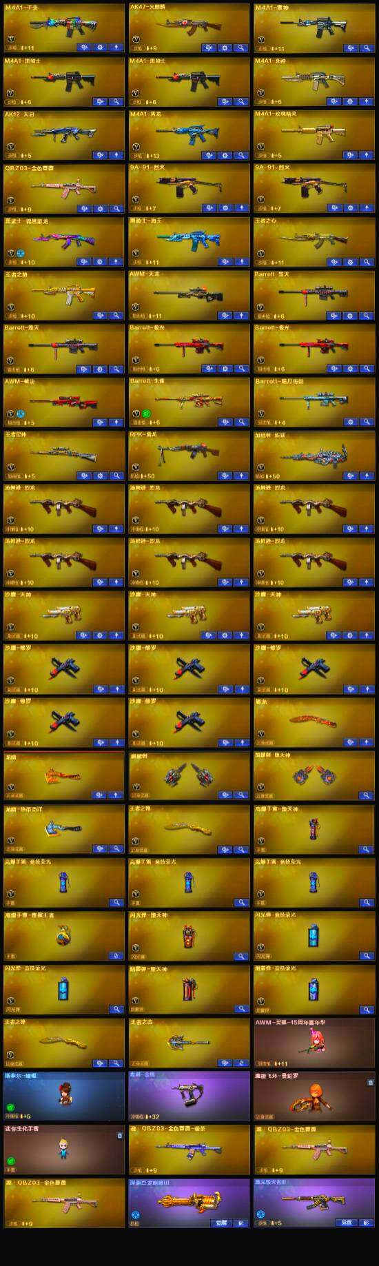 【热门武器】:QBZ03-金色蔷薇,M4A1-青龙,死亡之眼,M4A1-黑骑士*2,汤姆逊-烈龙*6,RPK-盘龙,加特林-炼狱,斯泰尔-蝴蝶,沙鹰-修罗*5