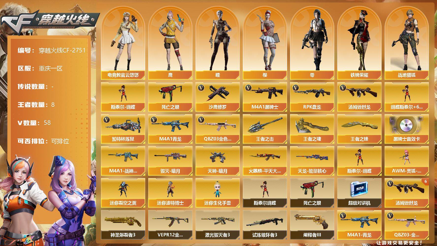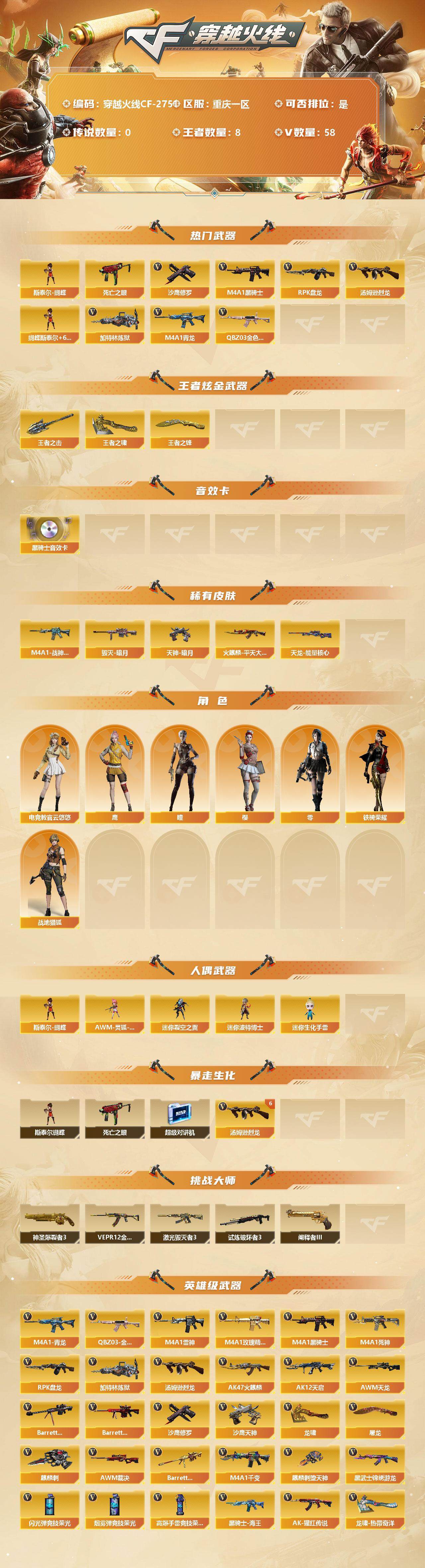 [12308957]【商品标题】:重庆一区-58V-8王者-0炫金 【热门武器】:QBZ03-金色蔷薇,M4A1-青龙,死亡之眼,M4A1-黑骑士*2,汤姆逊-烈龙*6,RPK-盘龙,加特林-炼狱,斯泰尔-蝴蝶,沙鹰-修罗*5 【王者炫金武器】:王者之啸,王者之击,王者之锋 【音效卡】:M4A1-黑骑士音效卡 【稀有皮肤】:M4A1-战神赵云,火麒麟-平天大圣,毁灭-暗月*2,天龙-能量核心,天神-暗月 【角色】:零,樱,瞳,电竞教官-云悠悠,鹰,战地猎狐,铁骑荣耀 【人偶武器】:斯泰尔-蝴蝶,AWM-灵狐-15周年嘉年华,迷你裂空之翼*5,迷你波特博士*2,迷你生化手雷 【暴走生化】:斯泰尔-蝴蝶,死亡之眼,超级对讲机 【挑战大师】:神圣爆裂者III,阐释者III,试炼破坏者III,激光毁灭者III,VEPR-12-金魔 【英雄级武器】:高爆手雷-竞技荣光*3,烟雾弹-竞技荣光,闪光弹-竞技荣光*2,麒麟刺-堕天神,QBZ03-金色蔷薇,M4A1-青龙,M4A1-雷神,M4A1-玫瑰精灵,M4A1-黑骑士*2,M4A1-死神,RPK-盘龙,加特林-炼狱,汤姆逊-烈龙*6,AK47-火麒麟,AK12-天启,AWM-天龙,Barrett-毁灭*2,Barrett-极光*2,AWM-裁决,Barrett-朱雀,M4A1-千变,黑武士-锦绣游龙,黑骑士-海王,AK-47-猩红传说,沙鹰-天神*3,沙鹰-修罗*5,麒麟刺,龙啸,屠龙,龙啸-热带奇洋 【特殊枪械】:蝴蝶斯泰尔+6烈龙,2黑骑士,6烈龙,1盘龙,1炼狱,1蝴蝶斯泰尔