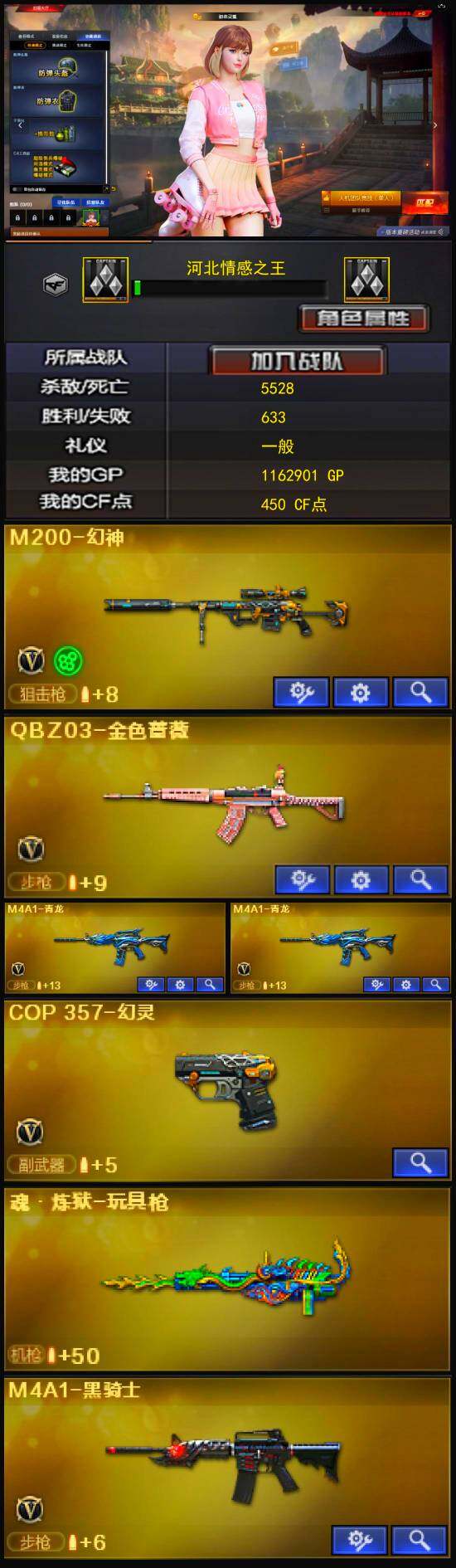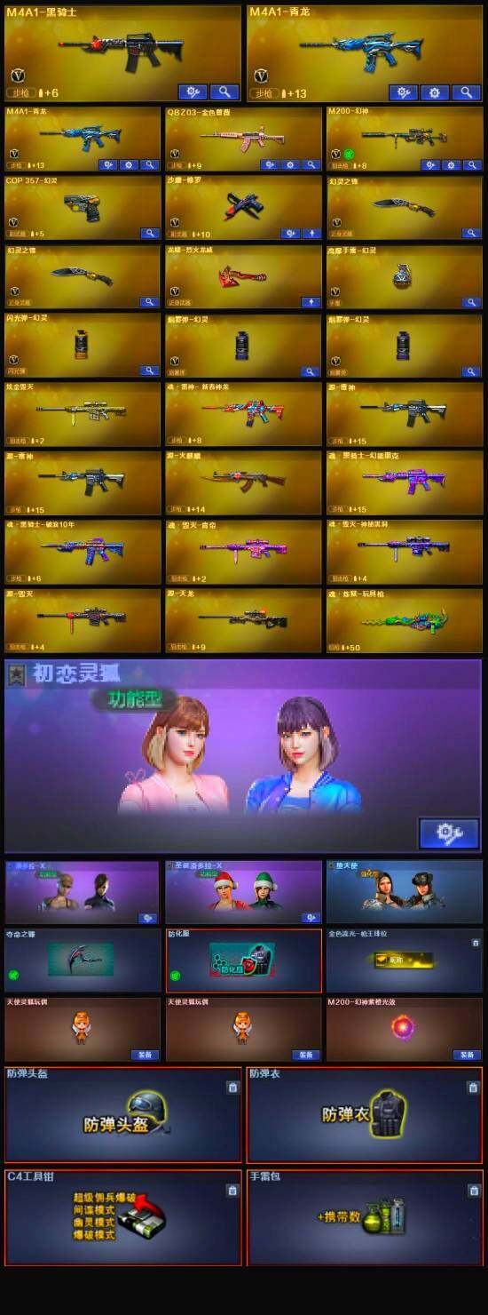 【英雄级武器】:COP 357-幻灵,幻灵之锋*2,QBZ03-金色蔷薇,M4A1-青龙*2,M4A1-黑骑士,M200-幻神,沙鹰-修罗