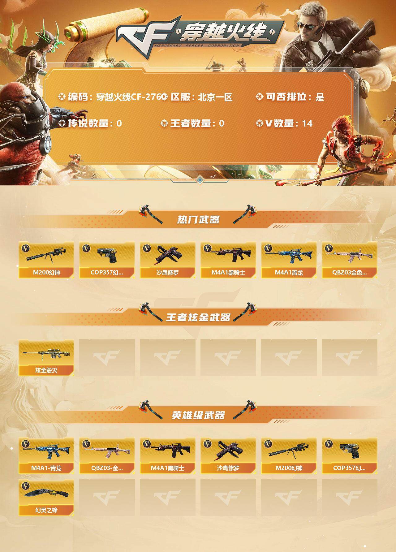 [12308987]【商品标题】:北京一区-14V-0王者-1炫金 【热门武器】:QBZ03-金色蔷薇,M4A1-青龙*2,M200-幻神,M4A1-黑骑士,COP 357-幻灵,沙鹰-修罗 【王者炫金武器】:炫金毁灭 【英雄级武器】:COP 357-幻灵,幻灵之锋*2,QBZ03-金色蔷薇,M4A1-青龙*2,M4A1-黑骑士,M200-幻神,沙鹰-修罗 【特殊枪械】:1黑骑士
