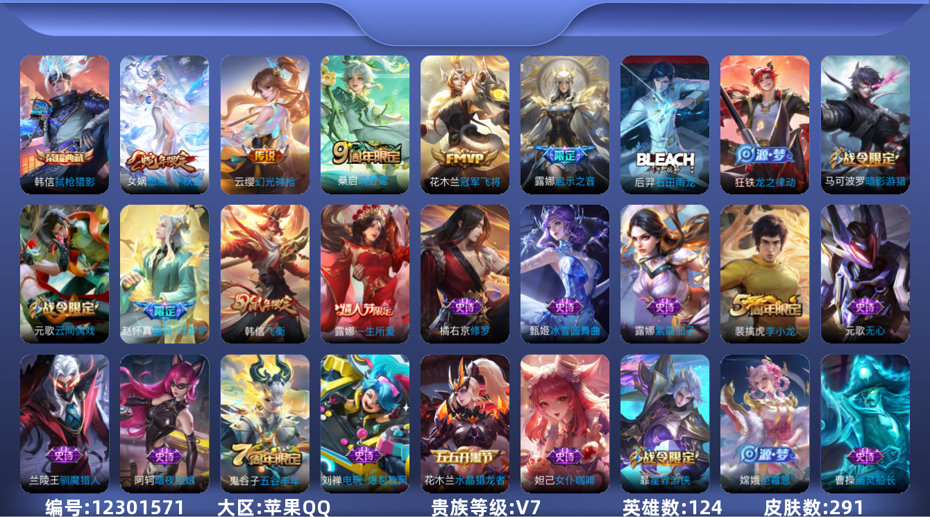 [12301571]V7 1典藏 5传说 124英雄 291皮肤 掉绑 不能改二次 不能改密码 荣耀水晶:弑枪猎影(韩信典藏) 传说皮:幻光神枪,冠军飞将 珍宝阁皮:优雅恋人,蔷薇恋人,女武神,玩趣恶龙 限定皮:愿照·千秋盛(女娲年限),鸣野蒿,魔法小厨娘,飞衡(韩信年限),遇见飞天,高山流水,五谷丰年,游园惊梦,梁祝,李小龙,逐梦之影,一生所爱,启示之音 史诗皮:器灵·浮梦炉,龙之律动,石田雨龙,紫霞仙子,苍穹之光,黄金分割率,特工魅影,江河有灵,蒙恬荣光圣徽,冰冠公主,偶像歌手,电玩·爆裂旋风,暗夜猫娘,末日机甲-吕布,猫狗日记-孙策,乱世虎臣,节奏热浪,修罗,女仆咖啡,摇滚巨星,水果甜心,天才门将,星夜王子,心灵骇客,功夫厨神,德古拉伯爵,暗隐猎兽者,幽灵船长,鬼剑武藏,舞动绿茵,纤云弄巧,繁星吟游(呼啦呼啦),拒霜思,缤纷独角兽,乘风破浪,逐浪之夏,水晶猎龙者,箭羽风息,金属风暴,原初追逐者,圣诞狂欢,圣诞恋歌,鹰眼统帅,王者之锤,魅力维加斯,黎明之约,无心,未来纪元-赵云