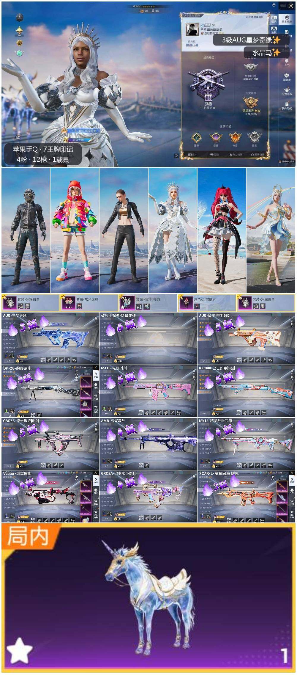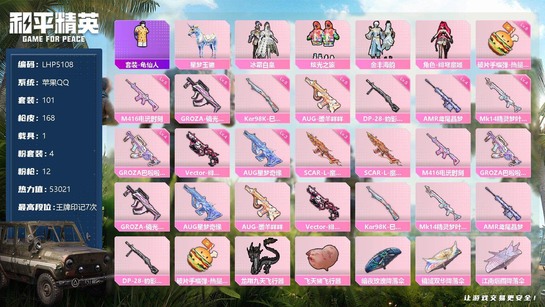 [12309856]素材身法号/地铁满天赋【特价急出/详情看图】:苹果 手Q-4粉装-12特效枪-1载具-3粉色飞行器-5.3w 热力值-7王牌印记-101套装-168枪皮【热门品类】:套装-龟仙人【粉色载具】:星梦玉骢【粉色套装】:粉装-冰霜白皇,粉装-炫光之旅,粉装-金丰海韵,角色-绯穹魔姬【粉色枪皮等级】:SCAR-L-魔童闹海 哪吒(三级),M416-电玩时刻(五级),GROZA-巴啦啦小魔仙(四级),GROZA-镜光银凌(五级),AUG-星梦奇缘(三级),AUG-暖羊咩咩(五级),Vector-绯穹魔姬(四级),Kar98K-巳巳如意(五级),Mk14-精灵梦叶罗丽(四级),AMR-鸢尾晶梦(四级),DP-28-豹影疾电(五级),破片手榴弹-热量炸弹(六级)【粉色飞行器】:龙翔九天飞行器,飞天猪飞行器