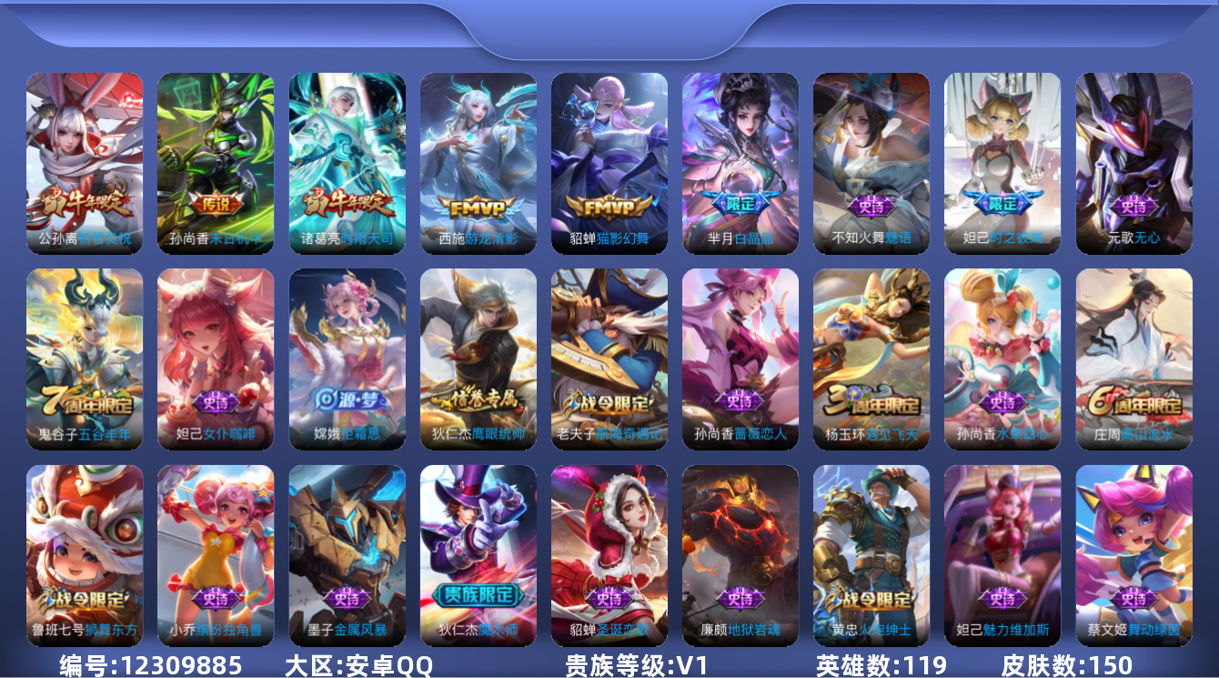 [12309885]【特价急出/详情看图】:安卓Q-V0-荣耀黄金II段位-119英雄-150皮肤-5传说-24史诗