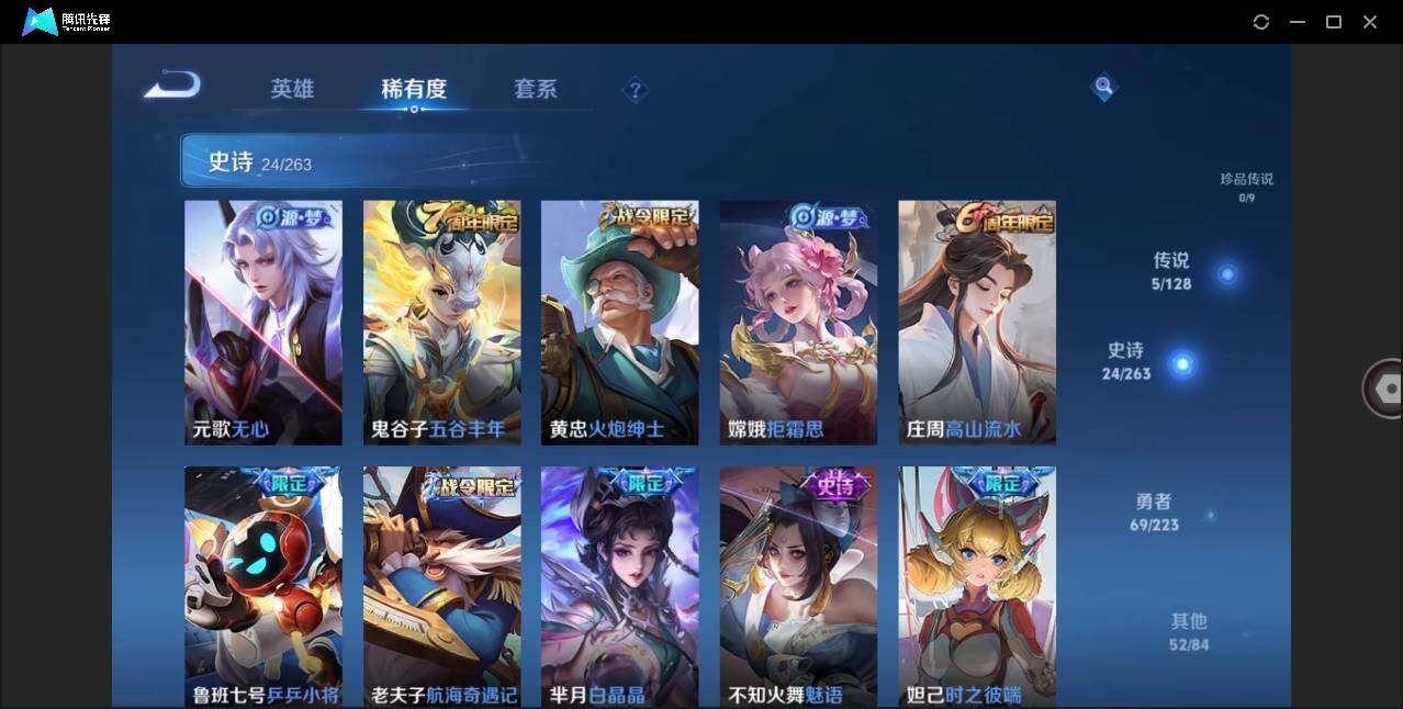 - [11938770]V8 1典藏 19传说 123英雄 304皮肤 可修改实名 优质装备:鸣剑·曳影,冠军飞将,久胜战神,炽阳神光,末日机甲-孙尚香(绿蚂蚱),地狱之眼,时之恋人-刘备(电焊工),无双飞将,山海·炽霜斩(李信年限),山海·苍雷引(电光曜子),画中仙,浮生妄 传说皮:幻光神枪 珍宝阁皮:万物之道,优雅恋人,玩趣恶龙 限定皮:愿照·九州拓(澜年限),愿照·山河定(司空震年限),逐霄战戟,鸣野蒿,至尊宝,傲雪梅枪,时雨天司(水龙头),瑞麟志(木兰年限),高山流水,齐天大圣,五谷丰年,梁祝,李小龙,朱雀志(守约年限),孙行者,寅虎·赤拳(老虎年限),百木心枪,山海·玄木吟(马可年限) 史诗皮:鸭鸭历险记-刘禅,器灵·浮梦炉,绮世丹青,化蝶舞,星界战将,龙之律动,石田雨龙,茶境仙,破空之剑,蒙犽顽岩魄,芈月浮光幕影,海诺心动手记,琥珀纪元伽罗,蔬乡物语(鲁班七号),百相守梦-百里守约,百相守梦-黄忠,织梦人,紫霞仙子,黄金分割率,特工魅影,千年之狐,永昼,江河有灵,魅语,高渐离燃音魔法,蒙恬荣光圣徽,无限星赏官,冰冠公主,偶像歌手,晚萤,电玩·爆裂旋风,末日机甲-吕布,猫狗日记-孙策,猫狗日记-大乔,乱世虎臣,节奏热浪,修罗,女仆咖啡,摇滚巨星,水果甜心,绅士熊喵,星夜王子,功夫厨神,德古拉伯爵,暗隐猎兽者,幽灵船长,鬼剑武藏,暗渊魔法,心灵战警,天秀·启明,舞动绿茵,纤云弄巧,缤纷独角兽,乘风破浪,逐浪之夏,龙鼓争鸣,水晶猎龙者,曙光守护者,热力回旋,唤灵魅影,金属风暴,圣诞狂欢,圣诞恋歌,鹰眼统帅,魅力维加斯,赏金猎手,奇遇舞章,无心,未来纪元-赵云
