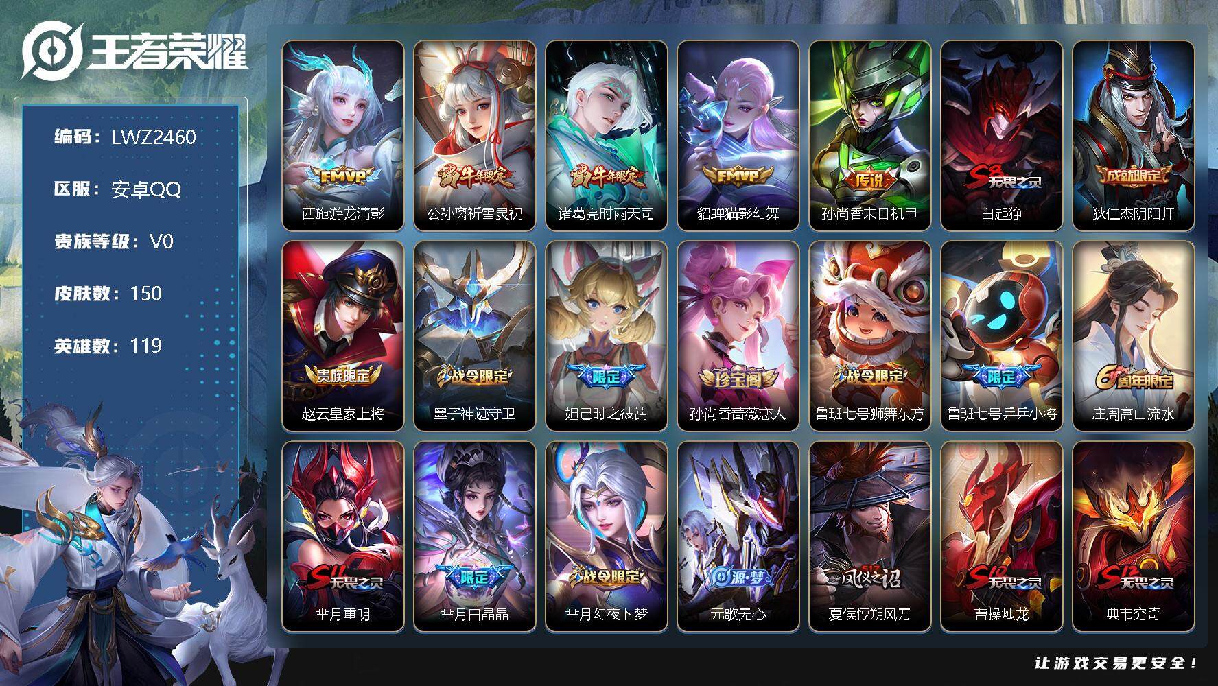 [12309885]【特价急出/详情看图】:安卓Q-V0-荣耀黄金II段位-119英雄-150皮肤-5传说-24史诗 【传说皮肤】:西施游龙清影,公孙离祈雪灵祝,诸葛亮时雨天司,貂蝉猫影幻舞,孙尚香末日机甲 【限定皮肤】:白起狰,狄仁杰阴阳师,赵云皇家上将,墨子神迹守卫,妲己时之彼端,孙尚香蔷薇恋人,鲁班七号狮舞东方,鲁班七号乒乒小将,庄周高山流水,芈月重明,芈月白晶晶,芈月幻夜卜梦,元歌无心,夏侯惇朔风刀,曹操烛龙,典韦穷奇,狄仁杰魔术师,狄仁杰万华元夜,达摩沙漠行僧,项羽海滩派对,老夫子航海奇遇记,程咬金演武夺筹,兰陵王金庭之子,亚瑟潮玩骑士王,李元芳云中旅人,钟馗神迹守卫,钟馗驱傩正仪,杨玉环遇见飞天,女娲朔望之晖,太乙真人饕餮,鬼谷子原初探秘者,鬼谷子五谷丰年,诸葛亮时雨天司,黄忠火炮绅士,苏烈千军破阵,公孙离祈雪灵祝,沈梦溪大漠名商,明世隐疑决卦,裴擒虎擒涛扼浪,狂铁御狮,米莱狄御霄,盾山御銮,嫦娥拒霜思,鲁班大师探海日志,张良古海寻踪,鬼谷子天穹祈灯 【年限皮肤】:公孙离祈雪灵祝,诸葛亮时雨天司 【赛季限定】:白起狰,芈月重明,夏侯惇朔风刀,曹操烛龙,典韦穷奇,狄仁杰万华元夜,达摩沙漠行僧,程咬金演武夺筹,兰陵王金庭之子,张良古海寻踪,李元芳云中旅人,钟馗驱傩正仪,太乙真人饕餮,鬼谷子原初探秘者,苏烈千军破阵,沈梦溪大漠名商,明世隐疑决卦,裴擒虎擒涛扼浪,狂铁御狮,米莱狄御霄,盾山御銮,鲁班大师探海日志,鬼谷子天穹祈灯 【战令限定】:墨子神迹守卫,鲁班七号狮舞东方,芈月幻夜卜梦,老夫子航海奇遇记,亚瑟潮玩骑士王,钟馗神迹守卫,女娲朔望之晖,黄忠火炮绅士 【史诗皮肤】:赵云皇家上将,貂蝉圣诞恋歌,狄仁杰魔术师,廉颇地狱岩魂,孙尚香蔷薇恋人,孙尚香水果甜心,妲己魅力维加斯,妲己女仆咖啡,墨子金属风暴,小乔缤纷独角兽,蔡文姬舞动绿茵,杨玉环遇见飞天,鲁班七号狮舞东方,狄仁杰鹰眼统帅,妲己时之彼端,不知火舞魅语,芈月白晶晶,老夫子航海奇遇记,鲁班七号乒乒小将,庄周高山流水,嫦娥拒霜思,黄忠火炮绅士,鬼谷子五谷丰年,元歌无心 【其他皮肤】:项羽海滩派对,韩信教廷特使,露娜哥特玫瑰,阿轲致命风华,阿轲爱心护理,达摩大发明家,赵云忍炎影,芈月红桃皇后,扁鹊化身博士,庄周鲤鱼之梦,宫本武藏未来纪元,安琪拉玩偶对对碰,姜子牙时尚教父,妲己少女阿狸,典韦黄金武士,亚瑟死亡骑士,甄姬花好人间,