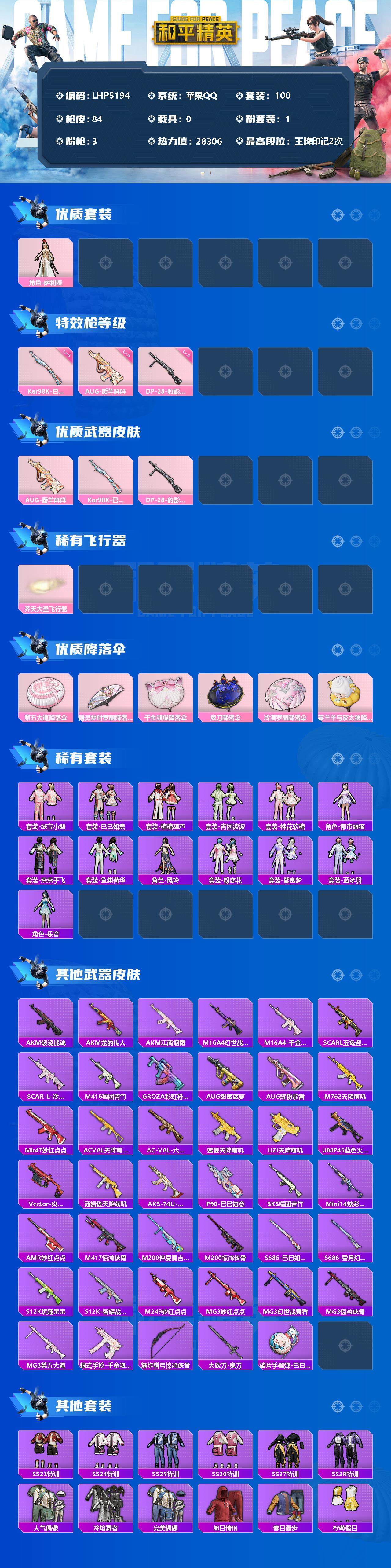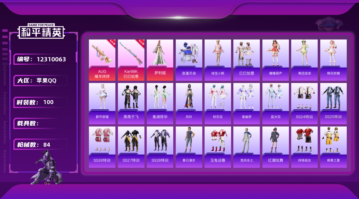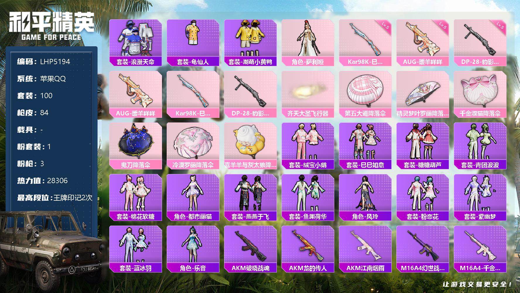 [12310063]【特价急出/详情看图】:苹果 手Q-1粉装-3特效枪-2粉色飞行器-2.8w热力值-2王牌印记-100套装-84枪皮【热门品类】:套装-浪漫天命,套装-龟仙人,套装-潮萌小黄鸭【粉色套装】:角色-萨利娅【粉色枪皮等级】:AUG-暖羊咩咩(五级),Kar98K-巳巳如意(五级),DP-28-豹影疾电(五级)【粉色飞行器】:齐天大圣飞行器