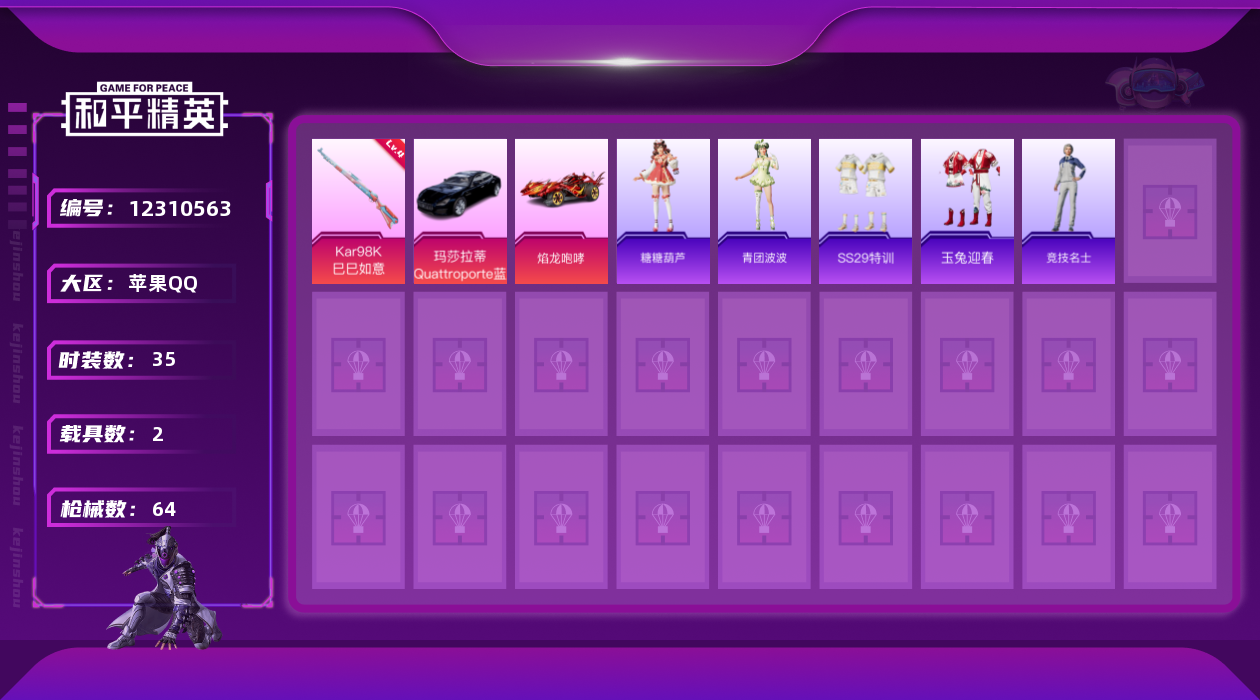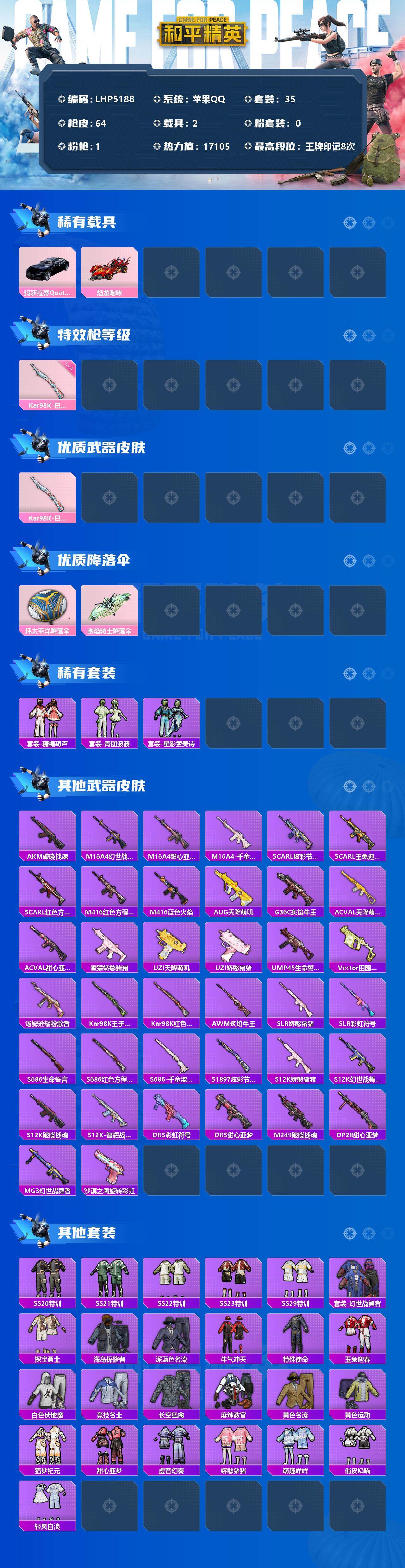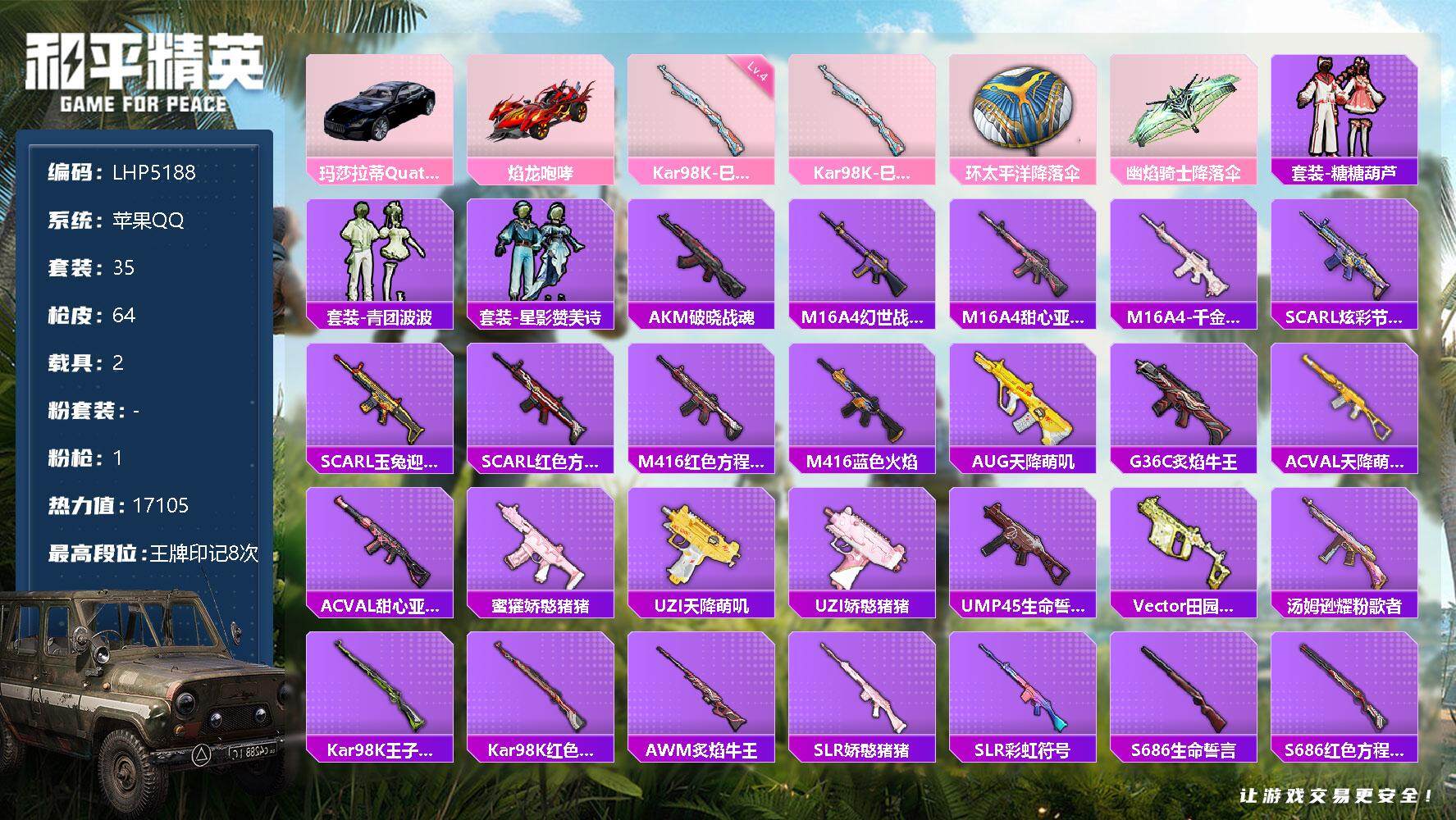 [12310563]【特价急出/详情看图】:苹果 手Q-1特效枪-2载具-1.7w热力值-8王牌印记-35套装-64枪皮【粉色载具】:玛莎拉蒂Quattroporte(夜幕蓝),焰龙咆哮【粉色枪皮等级】:Kar98K-巳巳如意(四级)