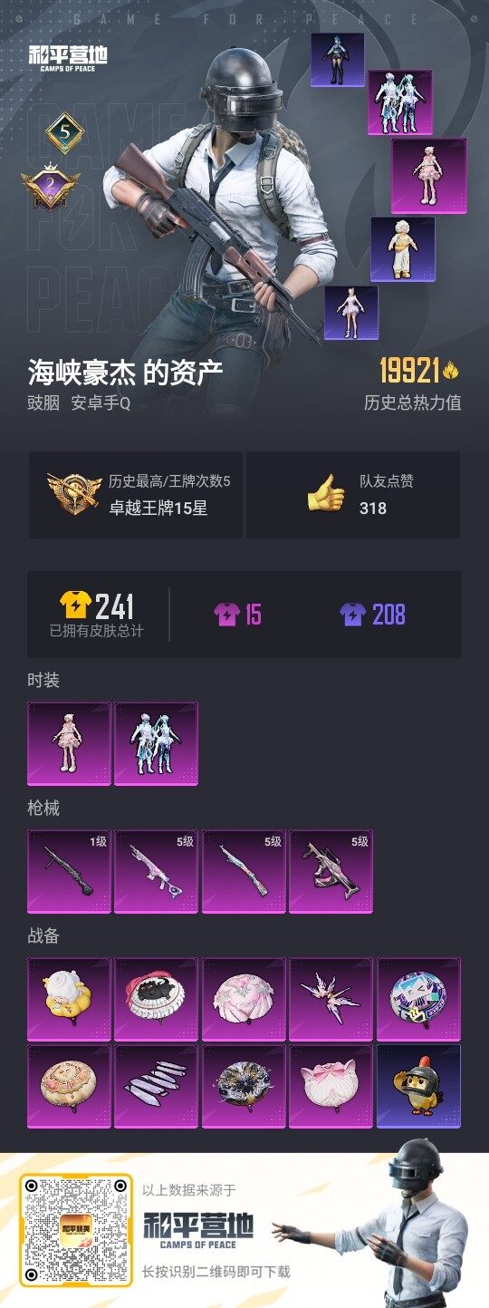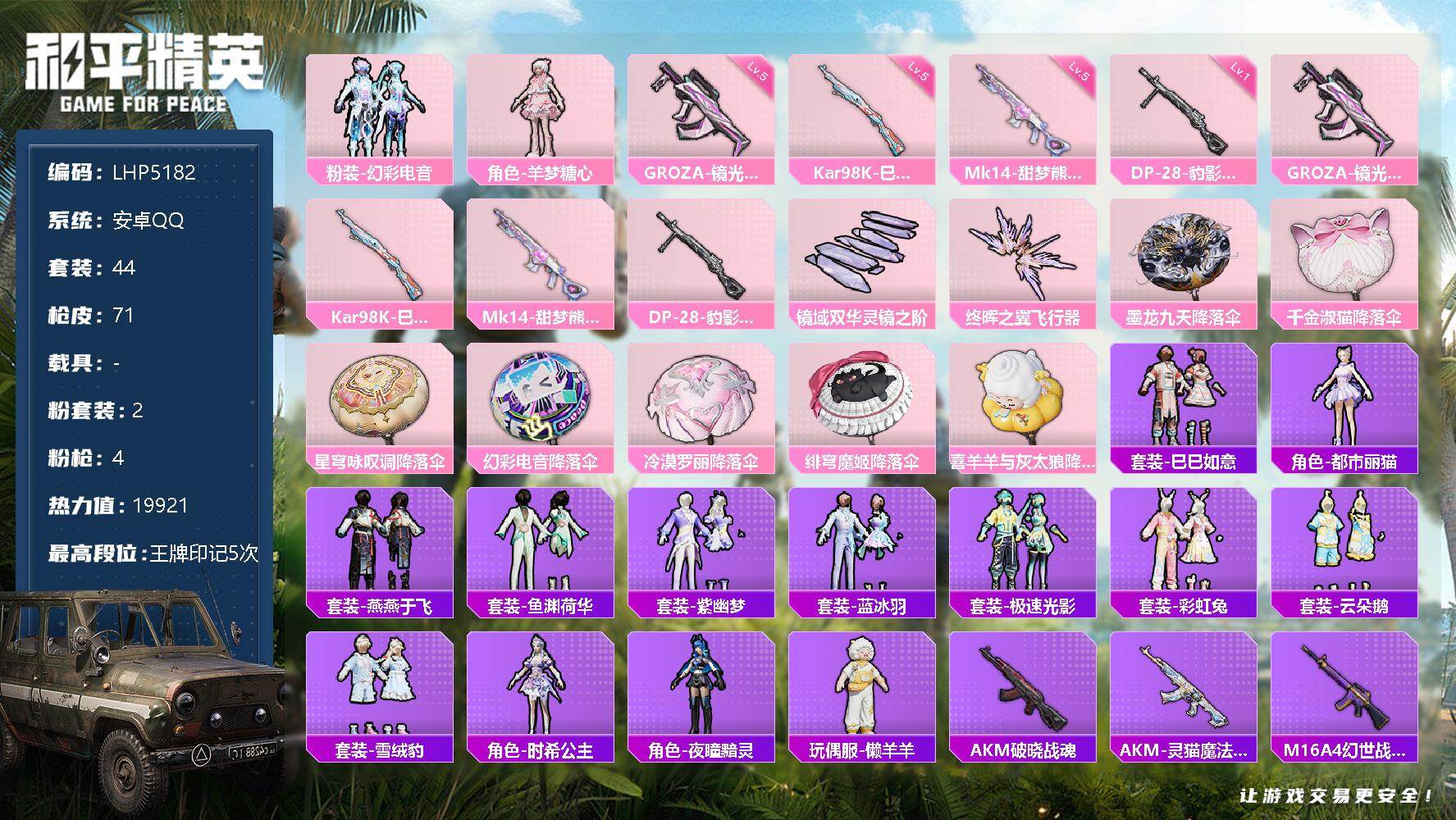 [12310664]【特价急出/详情看图】:安卓 手Q-2粉装-4特效枪-2粉色飞行器-1.9w热力值-5王牌印记-44套装-71枪皮【粉色套装】:粉装-幻彩电音,角色-羊梦糖心【粉色枪皮等级】:GROZA-镜光银凌(五级),Kar98K-巳巳如意(五级),Mk14-甜梦熊击(五级),DP-28-豹影疾电(一级)【粉色飞行器】:镜域双华-灵镜之阶,终晖之翼飞行器