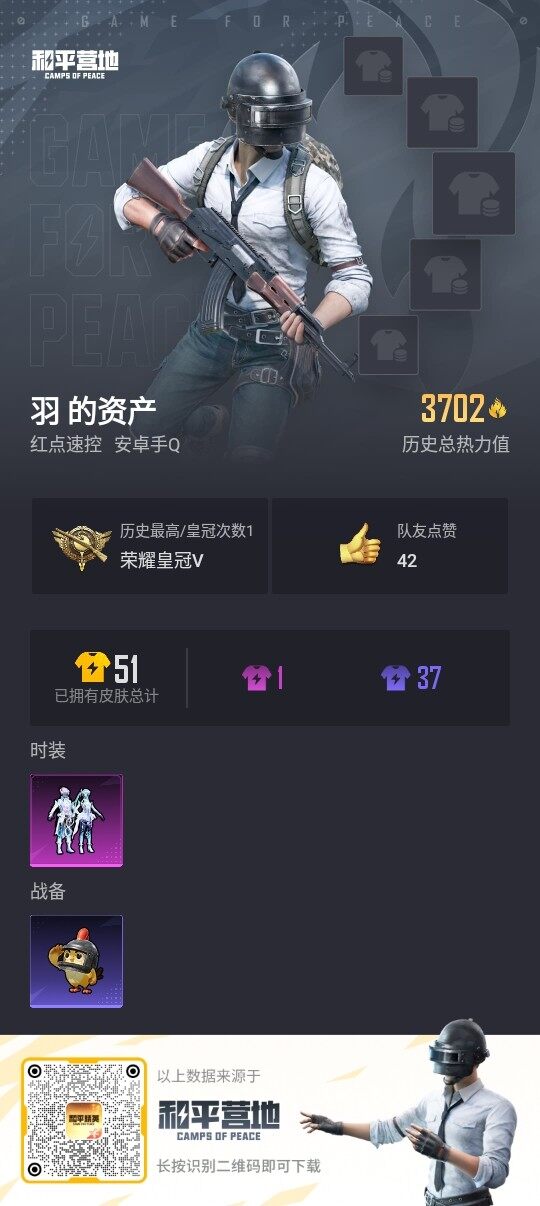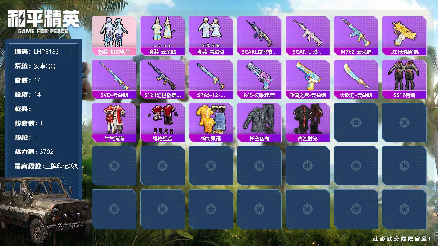 - PX_2064299- 安卓手Q-4王牌印记-2粉装-4特效枪-0载具-23210热力值-59套装-73枪皮-2卓越印记-1传奇印记 【2粉装】,天幕蝎影,圣堂之誓 【4特效枪】AKM-绿萝繁花-5级 SCAR-L-锦绣绵绵-5级 M416-风花雪月-7级 Kar98K-巳巳如意-5级 【3稀有紫装】,浪漫天命,雪山精英,龟仙人, 【59稀有时装】,SS31特训,SS33特训,SS32特训,灵