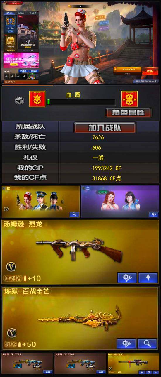 【英雄级武器】:M4A1-玫瑰精灵,汤姆逊-烈龙,AK12-天启,Barrett-毁灭,AK47-黑鲨,AK-47-猩红传说*7,AK47-B-战神,沙鹰-修罗,屠龙