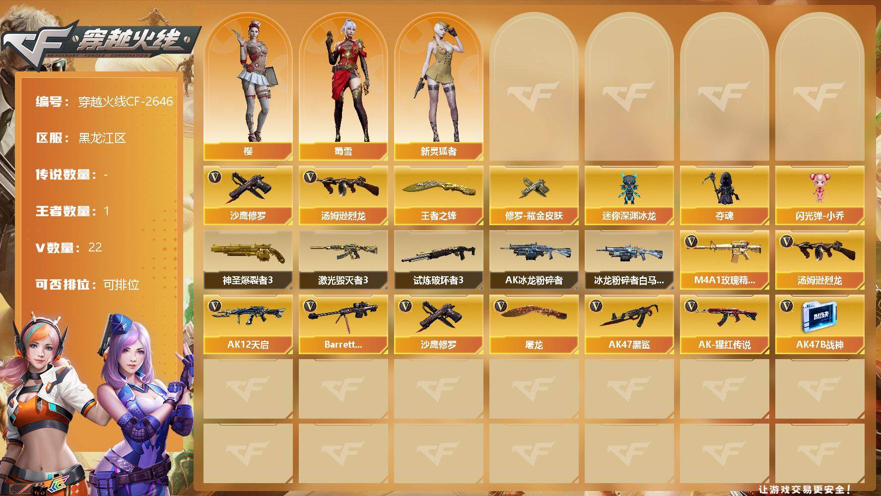 [12310737]【商品标题】:黑龙江区-22V-1王者-0炫金 【热门武器】:汤姆逊-烈龙,沙鹰-修罗 【王者炫金武器】:王者之锋 【稀有皮肤】:修罗耀金皮肤 【角色】:樱,蜀雪,新灵狐者 【人偶武器】:迷你深渊冰龙*4,夺魂,闪光弹-小乔 【挑战大师】:神圣爆裂者III,试炼破坏者III,激光毁灭者III,AK47-冰龙粉碎者,冰龙粉碎者-白马银枪 【英雄级武器】:M4A1-玫瑰精灵,汤姆逊-烈龙,AK12-天启,Barrett-毁灭,AK47-黑鲨,AK-47-猩红传说*7,AK47-B-战神,沙鹰-修罗,屠龙 【特殊枪械】:1烈龙