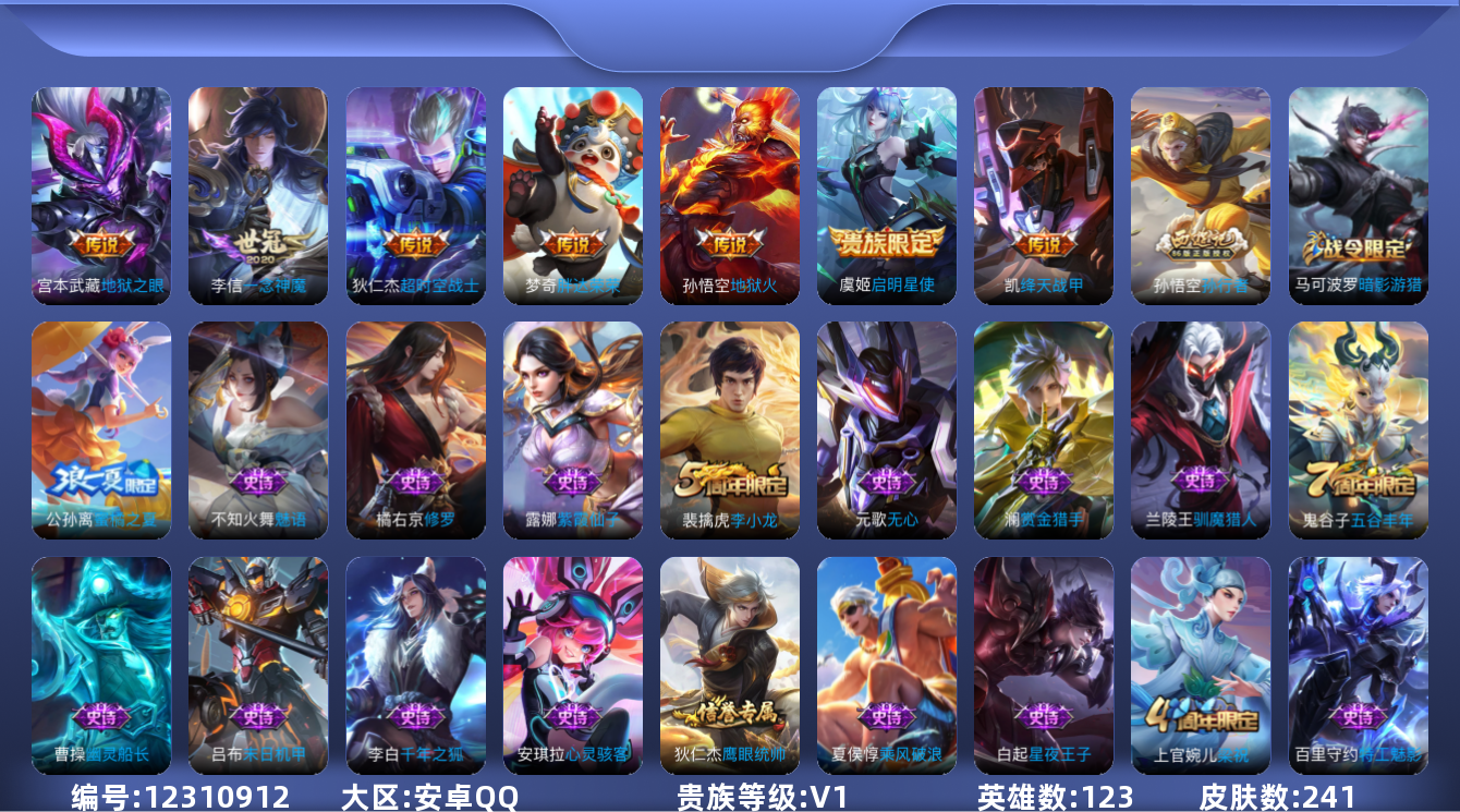 [12310912]【商品标题】:安卓Q-V0-永恒钻石IV段位-123英雄-241皮肤-0典藏-0珍品无双-0无双-0珍品传说-7传说-44史诗