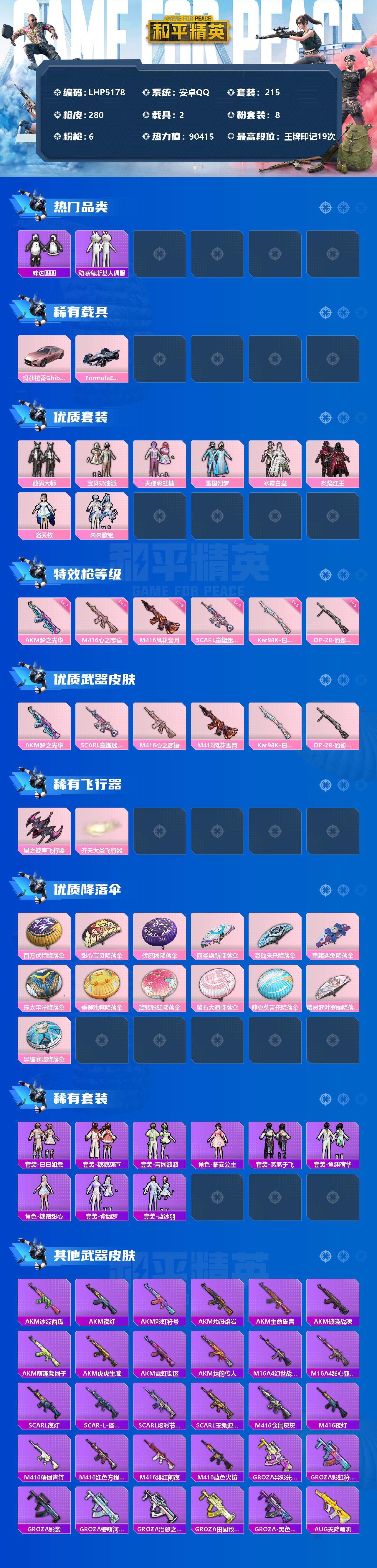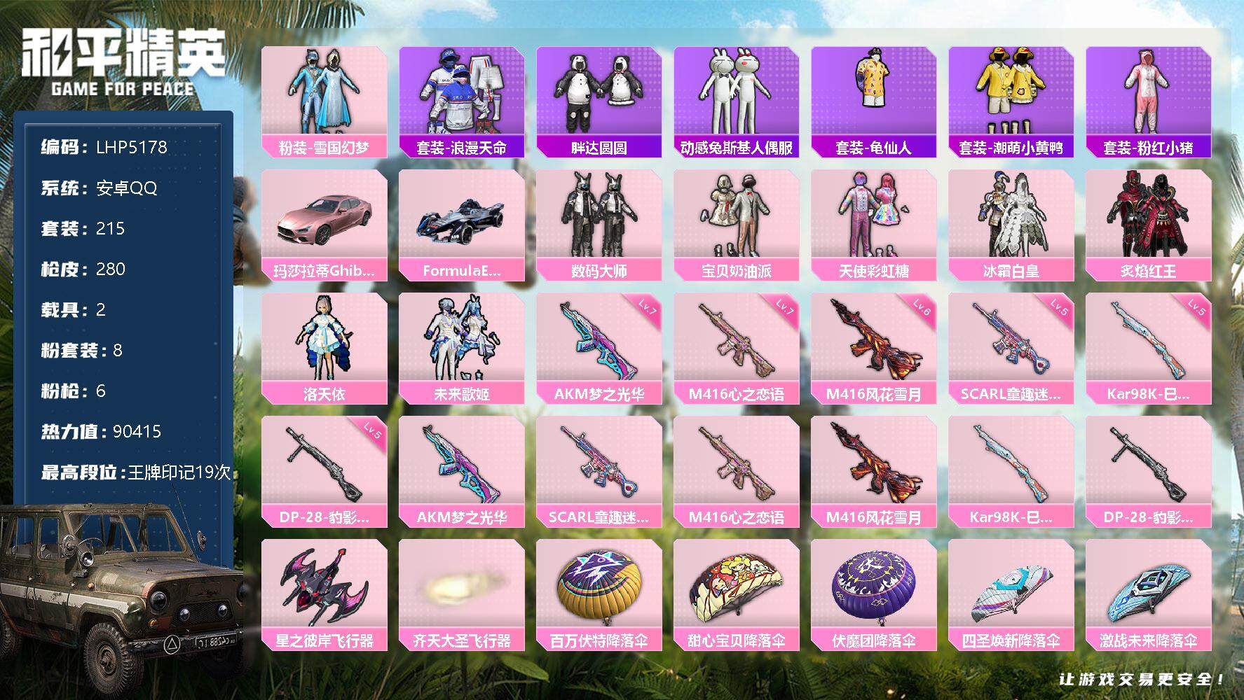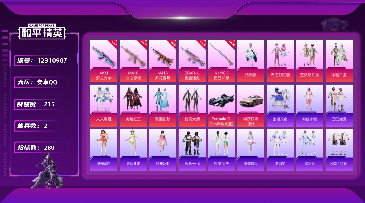 [12310907]素材身法号/绝世印记1【特价急出/详情看图】:安卓 手Q-8粉装-6特效枪-2载具-3粉色飞行器-9w热力值-19王牌印记-215套装-280枪皮【热门品类】:粉装-雪国幻梦,套装-浪漫天命,套装-胖达圆圆,套装-动感兔斯基人偶服,套装-龟仙人,套装-潮萌小黄鸭,套装-粉红小猪【粉色载具】:玛莎拉蒂Ghibli(粉),Formula E Gen2(幽光蓝)【粉色套装】:粉装-数码大师,粉装-宝贝奶油派,粉装-天使彩虹糖,粉装-雪国幻梦,粉装-冰霜白皇,粉装-炙焰红王,角色-洛天依,粉装-未来歌姬【粉色枪皮等级】:AKM-梦之光华(七级),SCAR-L-童趣迷兔(五级),M416-心之恋语(七级),M416-风花雪月(六级),Kar98K-巳巳如意(五级),DP-28-豹影疾电(五级)【粉色飞行器】:星之彼岸飞行器,齐天大圣飞行器
