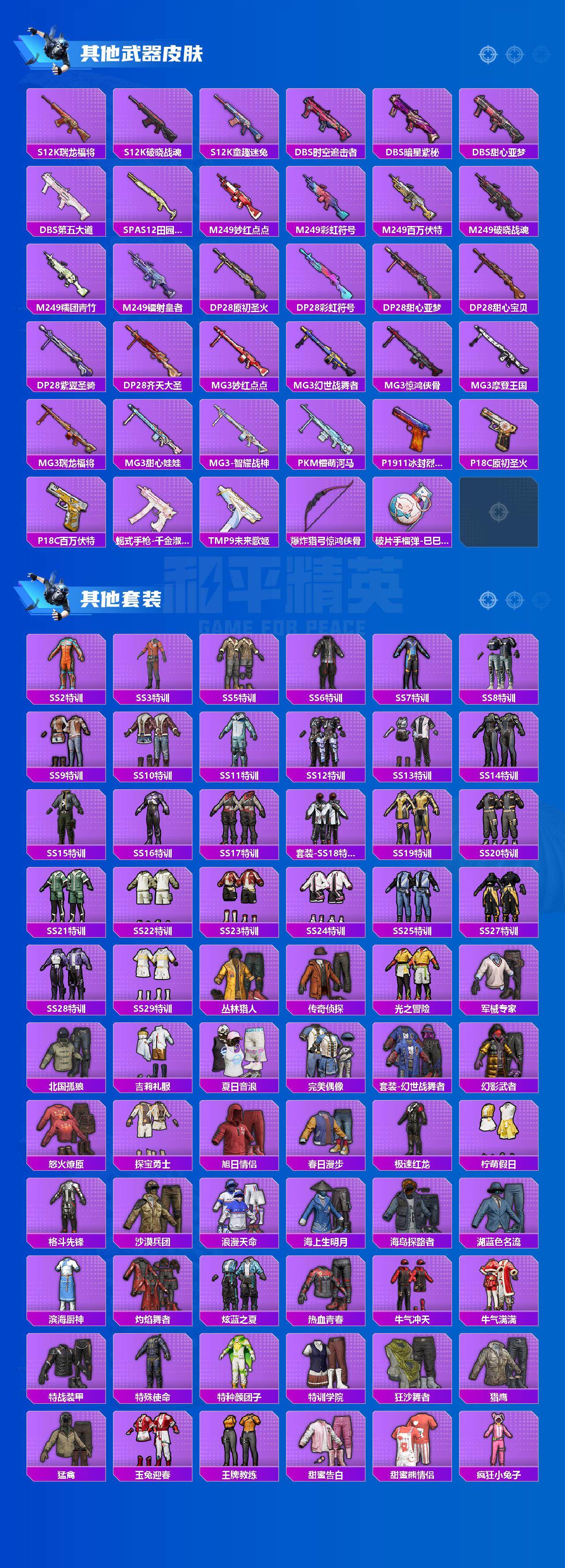 - [12058371]1红装 4粉装 6特效枪 7印记 可二次 可修改实名 身法装备:舞王派对(派对舞王、小金鞋) 优质装备:盛世惊鸿-云鸾,二级盛世惊鸿-云鸾(2级云鸾),舞王派对(派对舞王、小金鞋),M416心之恋语,绚金战神,PKM天星战神,AKM绿萝繁花,SCAR-L-锦绣绵绵,七级PKM-天星战神,七级M416-心之恋语,智耀战神,Kar98K-巳巳如意 热门装扮:幻影,莲影清波,鹰眼刺客,派对舞王(小金鞋) 稀有枪皮:DP-28-豹影疾电 五级特效枪:五级Kar98K-巳巳如意,五级SCAR-L-锦绣绵绵,五级AKM-绿萝繁花 四级特效枪:四级DP-28-豹影疾电 紫色装扮:SS31特训套装,六六大吉,旭日情侣,SS30特训套装,SS33特训套装,青涩时光,顶瓜瓜,竞技角斗士,天籁歌者,长空猛禽,霓虹街区,缤纷果语,耀眼新星,荣耀,蓝色运动,街头潮人,超能勇士,黄色运动,黑色伏地魔,龙的传人,龟仙人,冰河战士,龙魂突击队,蝶变,沙漠雄狮,海岛探路者,涂山之恋,坚韧舞者,夏日倾情,白色伏地魔,破蛋小黄鸡,甜蜜告白,空岛之星,红色运动,灰色格斗者,热血青春,雏菊兔兔,萝兰蝴蝶,SS29特训,星途旅人,白光莹,SS28特训,异域银装,鱼渊荷华,燕燕于飞,巳巳如意,森林游猎者,青团波波,糖糖葫芦,棉花软糖,竞技名士,临安公主,怀庆长公主,深海梦境,惊鸿侠骨,神气柴柴,懵萌河马,SS24特训(SS24特训套装),SS25特训,绝对偶像,金戈铁马,锦衣飞扬,星际旅行,焰鹰斗篷,幻羽潜行,幽夜迷踪,SS27特训,萌趣绒叽,浪漫天命,小丑鱼,晨曦薄雾,SS26特训,春光漫游,快闪甜心,贝斯之夜,智谋强哥,大橘大利,星渊小夜曲,粉恋花,蓝冰羽,紫幽梦,SS32特训服(SS32特训套装),青玉碎影,绯格组合,新风雅兰,恋语绒绒,漫步者,冰冻风暴 优质战备:圣堂之誓降落伞,创世·救赎降落伞,金丰海韵降落伞,镜光幻境降落伞,超新星降落伞,盛世惊鸿降落伞,凤舞九天飞行器,临安公主降落伞,智耀战神降落伞,桃粉嫣然降落伞,炫光之旅降落伞