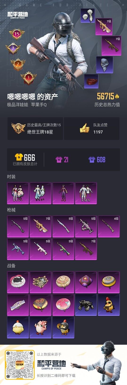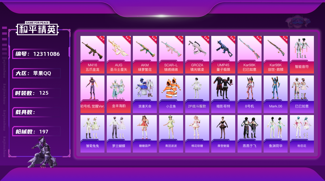 [12311086]素材身法号/绝世印记1【特价急出/详情看图】:苹果 手Q-4粉装-9特效枪-5.6w热力值-15王牌印记-125套装-197枪皮【热门品类】:套装-浪漫天命,套装-都市猎人,套装-小丑鱼,角色-2P战斗服款,套装-龟仙人,套装-暗影哥特,角色-8号机,角色-Mark.06,熔岩游骑兵面罩,熔岩游骑兵连帽夹克【粉色套装】:粉装-智能音符,角色-初号机 觉醒Ver.,粉装-金丰海韵,粉装-星穹咏叹调【粉色枪皮等级】:AKM-绿萝繁花(五级),SCAR-L-锦绣绵绵(五级),M416-五爪金龙(七级),GROZA-镜光银凌(五级),AUG-圣斗士星矢(七级),UMP45-量子极限(五级),Kar98K-创世·救赎(四级),Kar98K-巳巳如意(五级),DP-28-豹影疾电(五级)