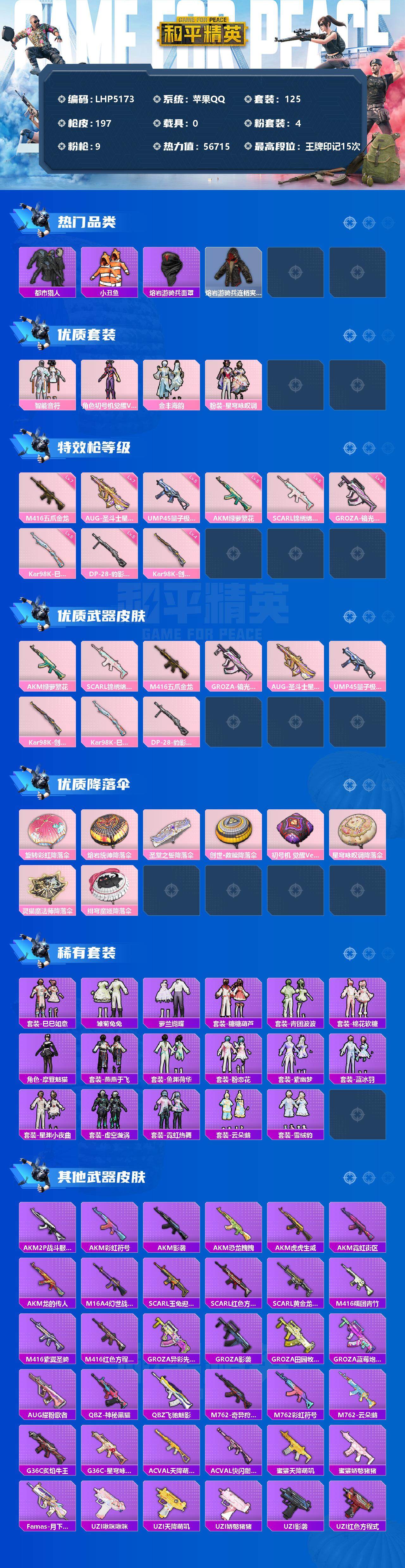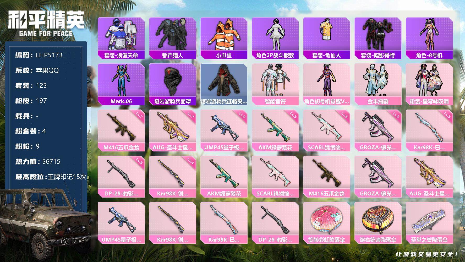 - PX_2109307-??框 满级心之恋语】YXc12560【无二次】【因赛季更新游戏段付以上号为准!】苹果Q-4w热力值 14王牌印记 历史无敌战神 105套装 142枪皮 【1载具】 玛莎拉蒂Q蓝色 【3粉装】 冷漠罗丽 新星烈龙 紫电风暴 【3特效枪】 M416-心之恋语 (7级) Kar98K-巳巳如意 (2级) 烟雾弹-电雾迷城 (5级) 【1飞行器】 冷魅冰骑飞行器 【7热门】 龟仙人