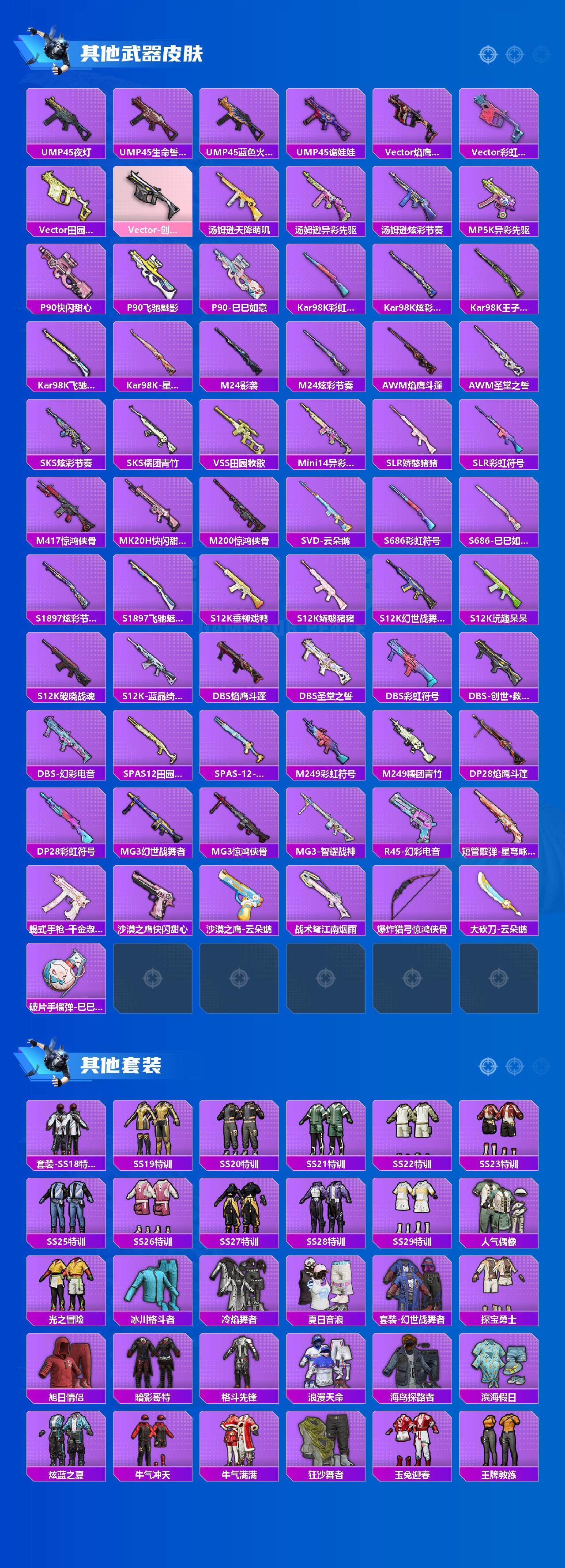 AKM-绿萝繁花,M416-五爪金龙,GROZA-镜光银凌,UMP45-量子极限,Kar98K-创世·救赎,Kar98K-巳巳如意