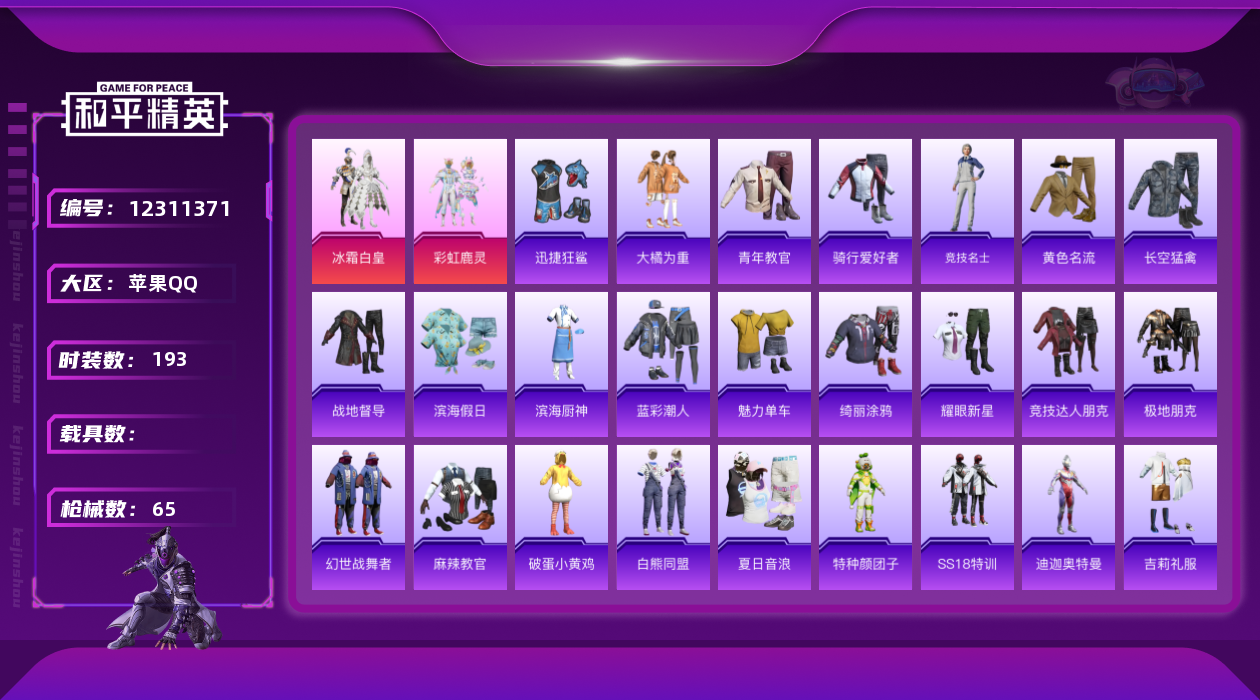 [12311371]2粉装 1印记 可二次 可修改实名 优质装备:冰霜白皇 热门装扮:彩虹鹿灵,大橘为重,迅捷狂鲨 紫色装扮:吉莉礼服,夏日音浪,幻世战舞者,时空追击者,暴风机械师,SS16特训,瑞龙福将,团圆交子,SS17特训,炫光向阳,特种颜团子,迪迦奥特曼,俏皮奶喵,战地督导,娇憨猪猪,萌趣咩咩,异彩先驱,SS18特训,雪兔飞飞,飞驰魅影,音速流光,SS19特训,骑行爱好者,魅力单车,麻辣教官,黄色名流,龟仙人,青年教官,长空猛禽,霓虹极客,深蓝色名流,滨海假日,滨海厨神,炫蓝之夏,极地朋克,绮丽涂鸦,耀眼新星,蓝彩潮人,竞技达人朋克,白熊同盟,破蛋小黄鸡,空岛之星,空投萌叽,竞技名士,SS24特训(SS24特训套装),SS26特训 优质战备:恐龙拽拽降落伞,橘柚倾心降落伞,童趣迷兔降落伞,飞行器-天之羽翼