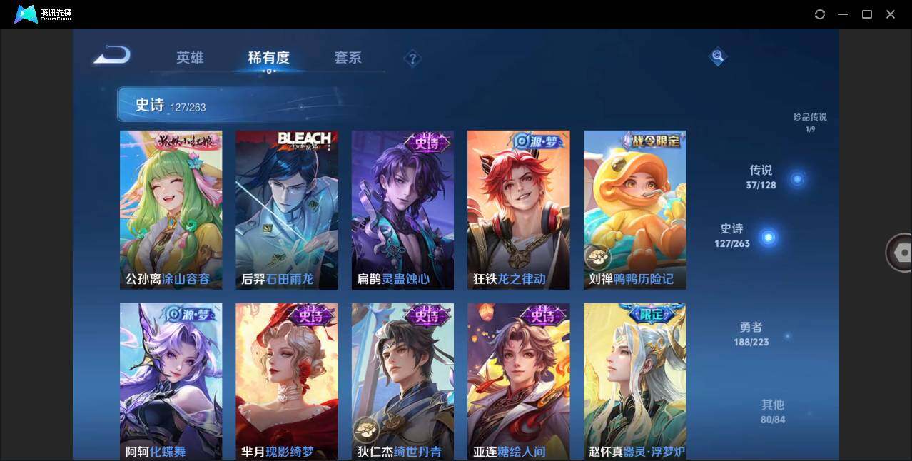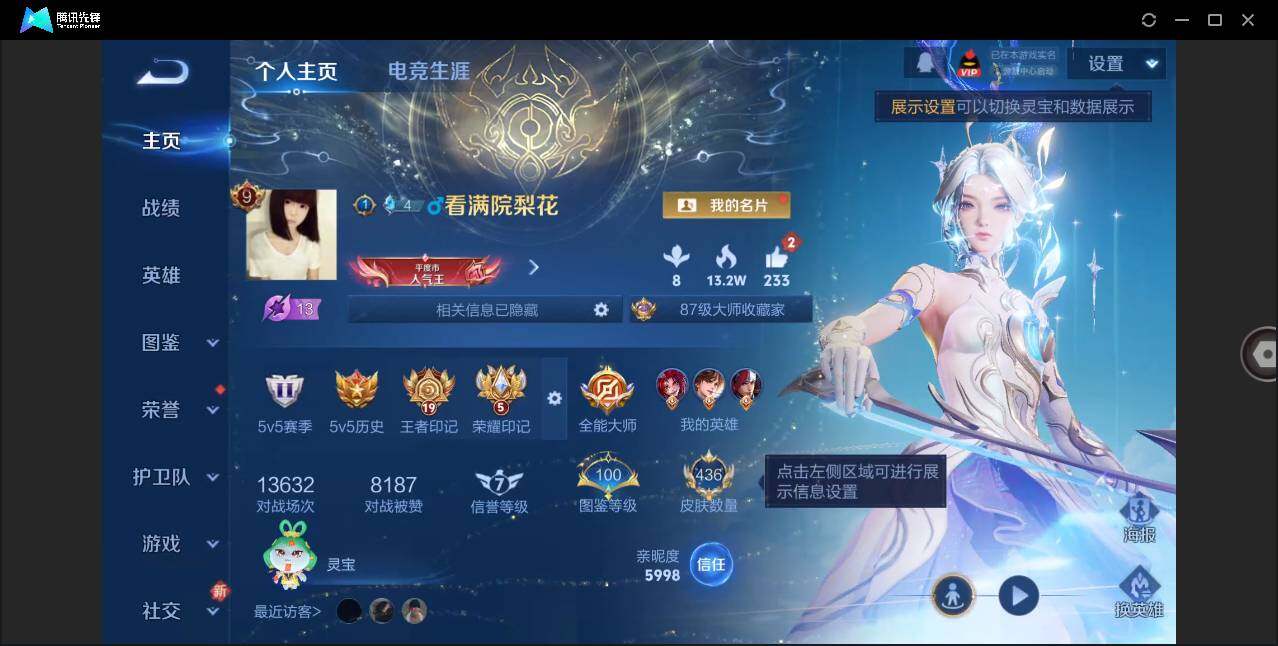 - [12018133]V8 1典藏 1珍品传说 16传说 122英雄 269皮肤 可修改实名 荣耀水晶:全息碎影(猴子典藏) 珍品传说:器灵·落星盏 传说皮:李逍遥,黄金白羊座,地狱火,久胜战神,胖达荣荣,画中仙,妄想奇谈 珍宝阁皮:胡桃夹子,女武神,玩趣恶龙 限定皮:愿照·千秋盛(女娲年限),逐霄战戟,鸣野蒿,至尊宝,白虎志(电光耗子),凤求凰(白切鸡),傲雪梅枪,补天,飞衡(韩信年限),诗剑行,五谷丰年,冰锋战神,武圣,天狼运算者,梁祝,逐梦之星,奔雷神使(牛魔年限),祈雪灵祝(雪兔子),李小龙,逐梦之影,朱雀志(守约年限),默契交锋-花木兰,孙行者,神器·万象笔,山海·玄木吟(马可年限) 史诗皮:茶境仙,化蝶舞,紫霞仙子,电玩小子(小书包),白龙吟,黄金分割率,特工魅影,千年之狐,电玩·爆裂旋风,冰冠公主,江河有灵,高渐离燃音魔法,蒙恬荣光圣徽,偶像歌手,晚萤,魅语,猫狗日记-孙策,猫狗日记-大乔,乱世虎臣,节奏热浪,修罗,摇滚巨星,水果甜心,绅士熊喵,天才门将,星夜王子,心灵骇客,功夫厨神,德古拉伯爵,暗隐猎兽者,幽灵船长,鬼剑武藏,乐园奇幻夜,天秀·启明,地狱岩魂,纤云弄巧,繁星吟游(呼啦呼啦),拒霜思,缤纷独角兽,逐浪之夏,水晶猎龙者,热力回旋,箭羽风息,金属风暴,原初追逐者,圣诞狂欢,圣诞恋歌,鹰眼统帅,暗夜贵公子,魅力维加斯,无心,未来纪元-赵云