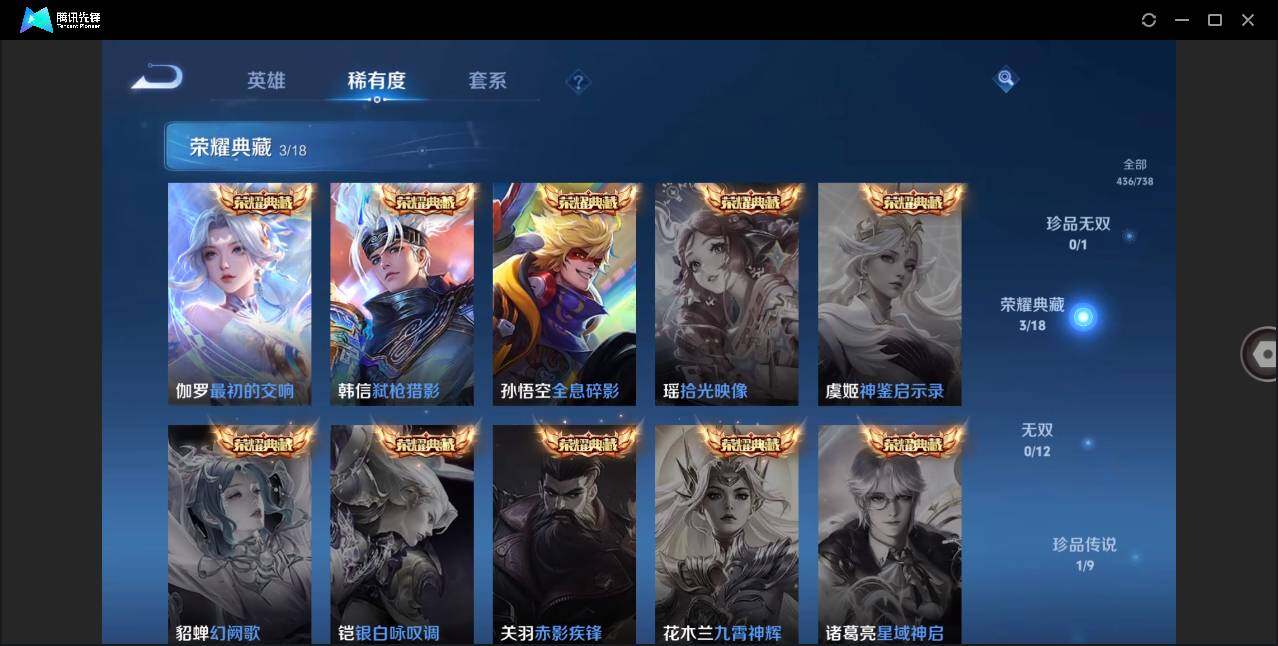 - [11530125]V9 2典藏 1无双 5珍品传说 27传说 124英雄 201皮肤 可修改实名 女号 优质装备:拾光映像(瑶典藏),雪境奇遇-甄姬,最初的交响(伽罗典藏),江户川柯南,器灵·落星盏,酷洛米之心,大耳狗之梦,绛天战甲(鸡嘴战神),猫影幻舞,久胜战神,末日机甲-孙尚香(绿蚂蚱),游龙清影(小青龙),超时空战士-狄仁杰,末日机甲-孙策,音你闪耀(rap皮),记忆之芯(机甲兔),追逃游戏(安琪拉),妄想奇谈,霜月吟,牧神诗旅 珍品传说:兔狲·蓬尾 传说皮:云诺千山,续相思,星之鸣奏,祥瑞亨通,幻光神枪 珍宝阁皮:妄想食味 限定皮:愿照·九州拓(澜年限),愿照·福禄聚(蔡文姬年限),愿照·岁时盈(虞姬年限),愿照·山河定(司空震年限),愿照·众生和(妲己年限),愿照·千秋盛(女娲年限),逐霄战戟,映山客,陌上桑,鸣野蒿 史诗皮:鸭鸭历险记-刘禅,器灵·浮梦炉,狼魂孤将,绮世丹青,瑰影绮梦,化蝶舞,龙之律动,雪豹·霜爪,藏狐·褐绒,布丁狗之誓,茶境仙,涂山红红,蔬乡物语(鲁班七号),乘龙·聚宝船(安琪拉年限),百相守梦-百里守约,星界特工,遇见神鹿,紫霞仙子,苍穹之光,特工魅影,魅语,高渐离燃音魔法,青蛇,偶像歌手,白蛇,龙骑士(小龙虾),末日机甲-吕布,节奏热浪,女仆咖啡,摇滚巨星,水果甜心,绅士熊喵,星夜王子,心灵骇客,时之奇旅-安琪拉,鬼剑武藏,心灵战警,乐园奇幻夜,舞动绿茵,地狱岩魂,诗语江南,纤云弄巧,拒霜思,缤纷独角兽,水晶猎龙者,唤灵魅影,鹰眼统帅,魅力维加斯,奇遇舞章