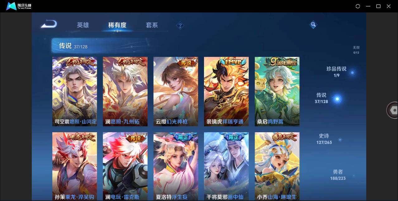 - [11625028]V8 15传说 124英雄 208皮肤 可修改实名 优质装备:时之恋人-刘备(电焊工),挚爱之约,神器·狴犴令,山海·炽霜斩(李信年限),浮生妄 传说皮:乘龙·问璇玑(孙尚香年限),乘龙·铭钟鼎(赵云年限),乘龙·淬吴钩(孙策年限),幻光神枪 珍宝阁皮:妄想食味,玩趣恶龙 限定皮:愿照·九州拓(澜年限),愿照·山河定(司空震年限),鸣野蒿,山海·碧波行(瑶年限),瑞麟志(木兰年限),高山流水,五谷丰年,玄武志(苏烈年限),孙行者,寅虎·御盾(廉颇年限),时之祈愿-瑶(瑶传限),唐三藏,枫霜尽,山海·玄木吟(马可年限) 史诗皮:化蝶舞,星界战将,谪仙醉月,百相守梦-黄忠,织梦人,遇见神鹿,紫霞仙子,黄金分割率,特工魅影,千年之狐,永昼,江河有灵,浮梦罗烟,魅语,百解令(蒙犽),蒙恬荣光圣徽,无限星赏官,偶像歌手,晚萤,电玩·爆裂旋风,末日机甲-吕布,猫狗日记-孙策,时之恋人-孙尚香,节奏热浪,修罗,水果甜心,星夜王子,心灵骇客,功夫厨神,暗隐猎兽者,鬼剑武藏,纤云弄巧,拒霜思,缤纷独角兽,乘风破浪,逐浪之夏,水晶猎龙者,曙光守护者,唤灵魅影,金属风暴,圣诞狂欢,圣诞恋歌,鹰眼统帅,暗夜贵公子,魅力维加斯,天秀·音浪,寅虎·御盾,无心