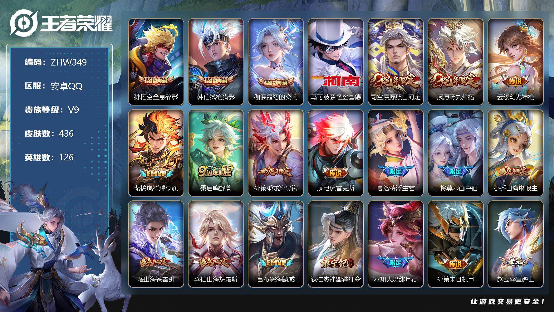 [12311512]打野34段/发育路34段【特价急出/详情看图】:安卓Q-V9-永恒钻石II段位-126英雄-436皮肤-3典藏-1珍品传说-37传说-127史诗 【英雄全皮】:刘禅全皮,太乙真人全皮,鬼谷子全皮,狂铁全皮,李信全皮,蒙恬全皮,司空震全皮,戈娅全皮,空空儿全皮,影全皮 【荣耀典藏】:孙悟空全息碎影,韩信弑枪猎影,伽罗最初的交响 【珍品传说】:马可波罗怪盗基德 【传说皮肤】:司空震愿照山河定,澜愿照九州拓,云缨幻光神枪,裴擒虎祥瑞亨通,桑启鸣野蒿,孙策乘龙淬吴钩,澜电玩雷克斯,夏洛特浮生妄,干将莫邪画中仙,小乔山海琳琅生,曜山海苍雷引,李信山海炽霜斩,吕布怒海麟威,狄仁杰神器狴犴令,不知火舞绯月行,孙策末日机甲,赵云淬星耀世,王昭君乞巧织情,周瑜音你心动,李元芳飞鸢探春,公孙离祈雪灵祝,诸葛亮时雨天司,铠绛天战甲,镜炽阳神光,虞姬启明星使,孙悟空零号赤焰,关羽武圣,曜云鹰飞将,李信一念神魔,刘备时之恋人,伽罗太华,张良黄金白羊座,干将莫邪久胜战神,虞姬云霓雀翎,百里玄策白虎志,李白凤求凰,孙悟空地狱火 【限定皮肤】:白起狰,蔡文姬夏日便利店,大乔绒语心约,虞姬夏日便利店,姜子牙天穹之誓,杨戬破阵退雄兵,李白谪仙醉月,狄仁杰阴阳师,虞姬凯尔特女王,小乔山海琳琅生,赵云皇家上将,嬴政白昼王子,孙尚香蔷薇恋人,高渐离死亡摇滚,钟无艳超时空战士,扁鹊奇幻香踪,白起夜都怪侠,芈月重明,吕布猎兽之王,元歌云间偶戏,元歌无心,夏侯惇朔风刀,甄姬落雪兰心,曹操烛龙,典韦穷奇,马可波罗逐梦之星,马可波罗山海玄木吟,狄仁杰魔术师,狄仁杰万华元夜,狄仁杰神器狴犴令,达摩沙漠行僧,项羽海滩派对,老夫子醍醐杖,关羽冰锋战神,关羽武圣,程咬金演武夺筹,露娜一生所爱,韩信逐梦之影,王昭君午后时光,兰陵王金庭之子,花木兰瑞麟志,花木兰默契交锋,不知火舞绯月行,亚瑟潮玩骑士王,孙悟空至尊宝,孙悟空大圣娶亲,孙悟空零号赤焰,牛魔御旌,后羿如梦令,李元芳云中旅人,虞姬启明星使,钟馗驱傩正仪,杨玉环遇见飞天,杨戬潮玩骑兵,女娲朔望之晖,干将莫邪画中仙,雅典娜单词大作战,雅典娜黎明之约,蔡文姬繁星吟游,太乙真人饕餮,太乙真人华丽摇滚,鬼谷子原初探秘者,鬼谷子五谷丰年,诸葛亮时雨天司,百里玄策白虎志,百里玄策原初追逐者,百里守约朱雀志,弈星混沌棋,梦奇顽趣,公孙离祈雪灵祝,沈梦溪大漠名商,沈梦溪匿光破解者,明世