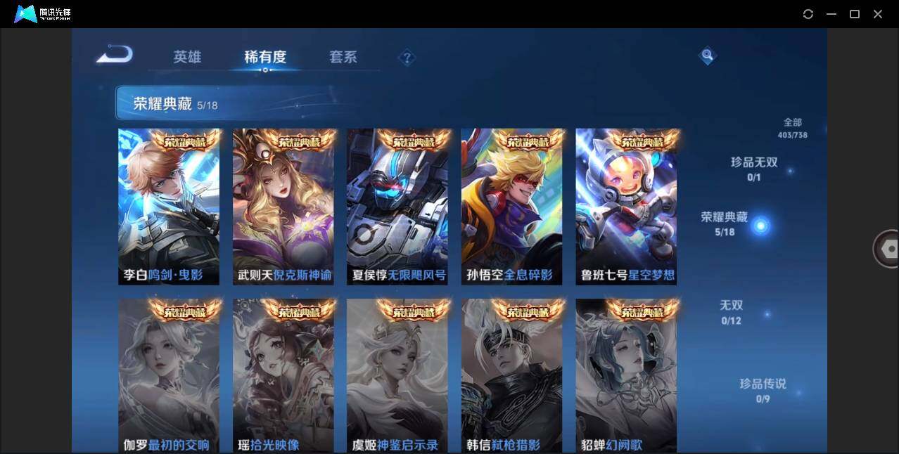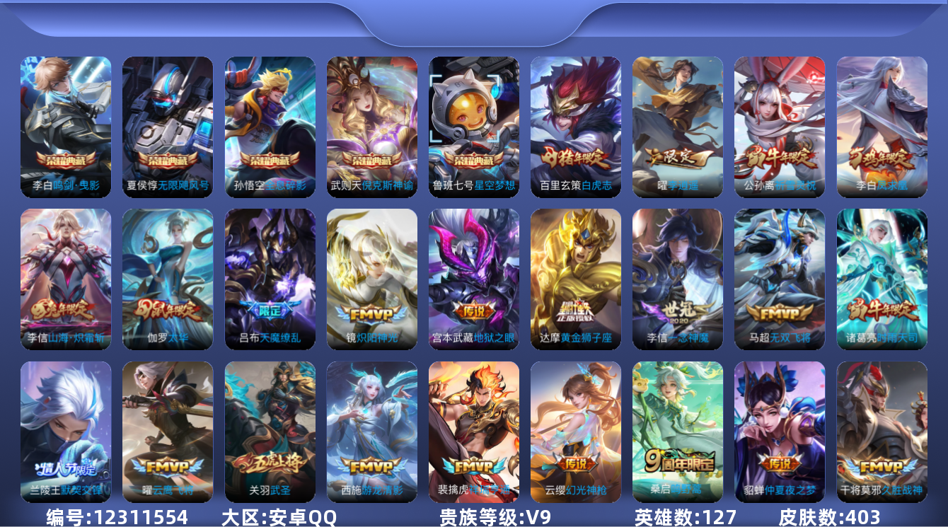 [12311554]【特价急出/详情看图】:安卓Q-V9-至尊星耀V段位-127英雄-403皮肤-5典藏-36传说-123史诗