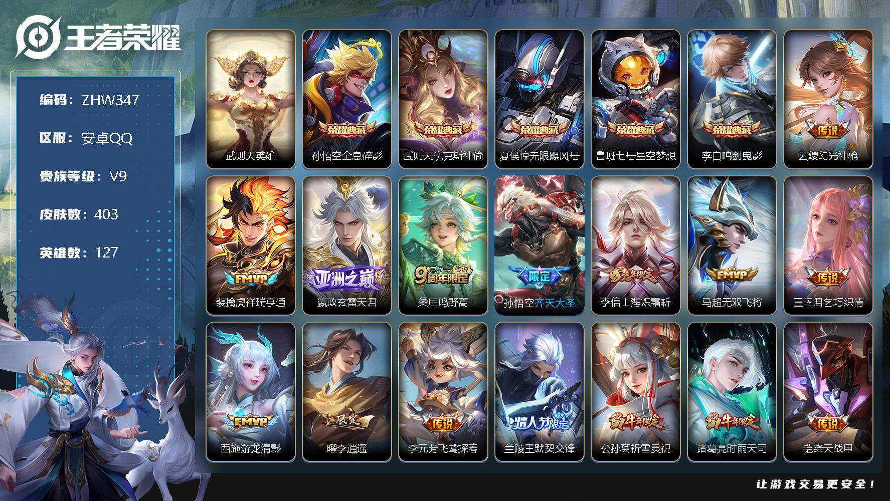 [12311554]【特价急出/详情看图】:安卓Q-V9-至尊星耀V段位-127英雄-403皮肤-5典藏-36传说-123史诗 【英雄全皮】:武则天全皮,李信全皮,蒙恬全皮,影全皮 【荣耀典藏】:武则天英雄,孙悟空全息碎影,武则天倪克斯神谕,夏侯惇无限飓风号,鲁班七号星空梦想,李白鸣剑曳影 【传说皮肤】:云缨幻光神枪,裴擒虎祥瑞亨通,嬴政玄雷天君,桑启鸣野蒿,孙悟空齐天大圣,李信山海炽霜斩,马超无双飞将,王昭君乞巧织情,西施游龙清影,曜李逍遥 ,李元芳飞鸢探春,兰陵王默契交锋,公孙离祈雪灵祝,诸葛亮时雨天司,铠绛天战甲,镜炽阳神光,虞姬启明星使,孙悟空零号赤焰,关羽武圣,曜云鹰飞将,李信一念神魔,伽罗太华,貂蝉猫影幻舞,干将莫邪久胜战神,虞姬云霓雀翎,达摩黄金狮子座,百里玄策白虎志,花木兰冠军飞将,梦奇胖达荣荣,后羿黄金射手座,貂蝉仲夏夜之梦,李白凤求凰,宫本武藏地狱之眼,孙悟空地狱火,吕布天魔缭乱,武则天海洋之心 【限定皮肤】:白起狰,暃埋骨钱,蒙犽顽岩魄,蔡文姬夏日便利店,虞姬夏日便利店,姜子牙天穹之誓,杨戬破阵退雄兵,狄仁杰阴阳师,赵云皇家上将,赵云引擎之心,赵云龙胆,墨子神迹守卫,孙尚香蔷薇恋人,鲁班七号狮舞东方,庄周玄嵩,庄周高山流水,阿轲迷踪丽影,钟无艳王者之锤,芈月重明,芈月白晶晶,吕布天魔缭乱,吕布御风骁将,周瑜赤莲之焰,元歌云间偶戏,元歌无心,甄姬幽恒,甄姬游园惊梦,曹操烛龙,典韦穷奇,典韦蓝屏警告,典韦岱宗,马可波罗逐梦之星,马可波罗暗影游猎,狄仁杰魔术师,狄仁杰万华元夜,达摩星际陆战队,达摩沙漠行僧,项羽海滩派对,项羽霸王别姬,老夫子醍醐杖,老夫子航海奇遇记,关羽冰锋战神,关羽武圣,程咬金演武夺筹,刘邦夺宝奇兵,韩信逐梦之影,韩信飞衡,兰陵王默契交锋,兰陵王金庭之子,花木兰默契交锋,亚瑟潮玩骑士王,孙悟空零号赤焰,孙悟空齐天大圣,牛魔御旌,牛魔奔雷神使,后羿如梦令,后羿圣弓游侠,李元芳银河之约,李元芳云中旅人,虞姬霸王别姬,虞姬启明星使,钟馗神迹守卫,钟馗驱傩正仪,杨玉环遇见飞天,女娲朔望之晖,干将莫邪冰霜恋舞曲,干将莫邪真爱魔法,雅典娜单词大作战,雅典娜黎明之约,蔡文姬繁星吟游,太乙真人饕餮,鬼谷子原初探秘者,鬼谷子五谷丰年,诸葛亮时雨天司,大乔白鹤梁神女,黄忠烈魂,铠青龙志,苏烈千军破阵,百里玄策白虎志,百里玄策原初追逐者,百里守约朱雀志,弈星混沌棋,梦奇顽