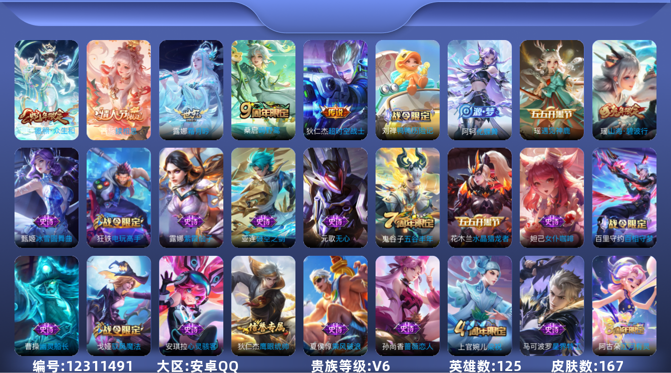 [12311491]【特价急出/详情看图】:安卓Q-V6-永恒钻石IV段位-125英雄-167皮肤-5传说-46史诗
