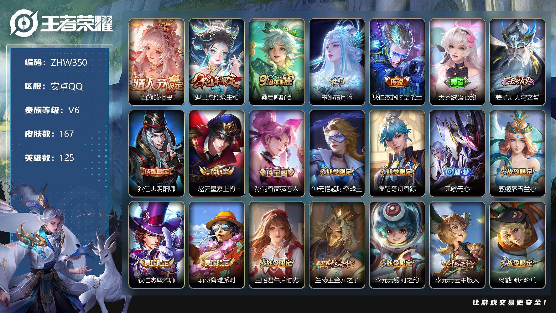 [12311491]【特价急出/详情看图】:安卓Q-V6-永恒钻石IV段位-125英雄-167皮肤-5传说-46史诗 【传说皮肤】:西施续相思,妲己愿照众生和,桑启鸣野蒿,露娜霜月吟,狄仁杰超时空战士 【限定皮肤】:大乔绒语心约,姜子牙天穹之誓,狄仁杰阴阳师,赵云皇家上将,孙尚香蔷薇恋人,钟无艳超时空战士,扁鹊奇幻香踪,元歌无心,甄姬落雪兰心,狄仁杰魔术师,项羽海滩派对,王昭君午后时光,兰陵王金庭之子,李元芳银河之约,李元芳云中旅人,杨戬潮玩骑兵,鬼谷子五谷丰年,沈梦溪大漠名商,明世隐吟游魔法,裴擒虎擒涛扼浪,狂铁电玩高手,瑶山海碧波行,上官婉儿梁祝,西施玲珑珍味,鲁班大师探海日志,桑启海盐诗旅,戈娅驭风魔法,阿古朵江河有灵,张良古海寻踪,鬼谷子天穹祈灯,沈梦溪龙舞盛年,刘邦剑破天穹,程咬金群星魔术团,周瑜熔金海岸 【年限皮肤】:瑶山海碧波行 【赛季限定】:兰陵王金庭之子,张良古海寻踪,李元芳云中旅人,沈梦溪大漠名商,裴擒虎擒涛扼浪,鲁班大师探海日志,桑启海盐诗旅,鬼谷子天穹祈灯,刘邦剑破天穹,姜子牙天穹之誓 【战令限定】:钟无艳超时空战士,扁鹊奇幻香踪,甄姬落雪兰心,王昭君午后时光,李元芳银河之约,杨戬潮玩骑兵,明世隐吟游魔法,狂铁电玩高手,西施玲珑珍味,戈娅驭风魔法 【史诗皮肤】:露娜紫霞仙子,赵云皇家上将,赵云未来纪元,甄姬冰雪圆舞曲,王昭君偶像歌手,狄仁杰魔术师,宫本武藏鬼剑武藏,孙尚香蔷薇恋人,孙尚香水果甜心,嬴政摇滚巨星,妲己魅力维加斯,妲己女仆咖啡,墨子金属风暴,刘禅绅士熊喵,曹操幽灵船长,花木兰水晶猎龙者,刘邦德古拉伯爵,夏侯惇乘风破浪,小乔缤纷独角兽,雅典娜冰冠公主,安琪拉心灵骇客,李元芳逐浪之夏,程咬金功夫厨神,阿轲节奏热浪,孙策猫狗日记,狄仁杰鹰眼统帅,上官婉儿梁祝,李元芳银河之约,瑶遇见神鹿,沈梦溪月团寄思,明世隐吟游魔法,貂蝉唤灵魅影,狂铁电玩高手,钟无艳超时空战士,鬼谷子五谷丰年,元歌无心,瑶山海碧波行,扁鹊奇幻香踪,戈娅驭风魔法,阿古朵江河有灵,亚连破空之剑,马可波罗星界特工,百里守约百相守梦,孙膑茶境仙,阿轲化蝶舞,刘禅鸭鸭历险记 【其他皮肤】:项羽海滩派对,韩信教廷特使,韩信街头霸王,赵云白执事,赵云忍炎影,程咬金星际陆战队,扁鹊化身博士,宫本武藏未来纪元,安琪拉玩偶对对碰,典韦黄金武士,亚瑟死亡骑士,达摩拳王,花木兰兔女郎,甄姬花好人间,刘备万事如