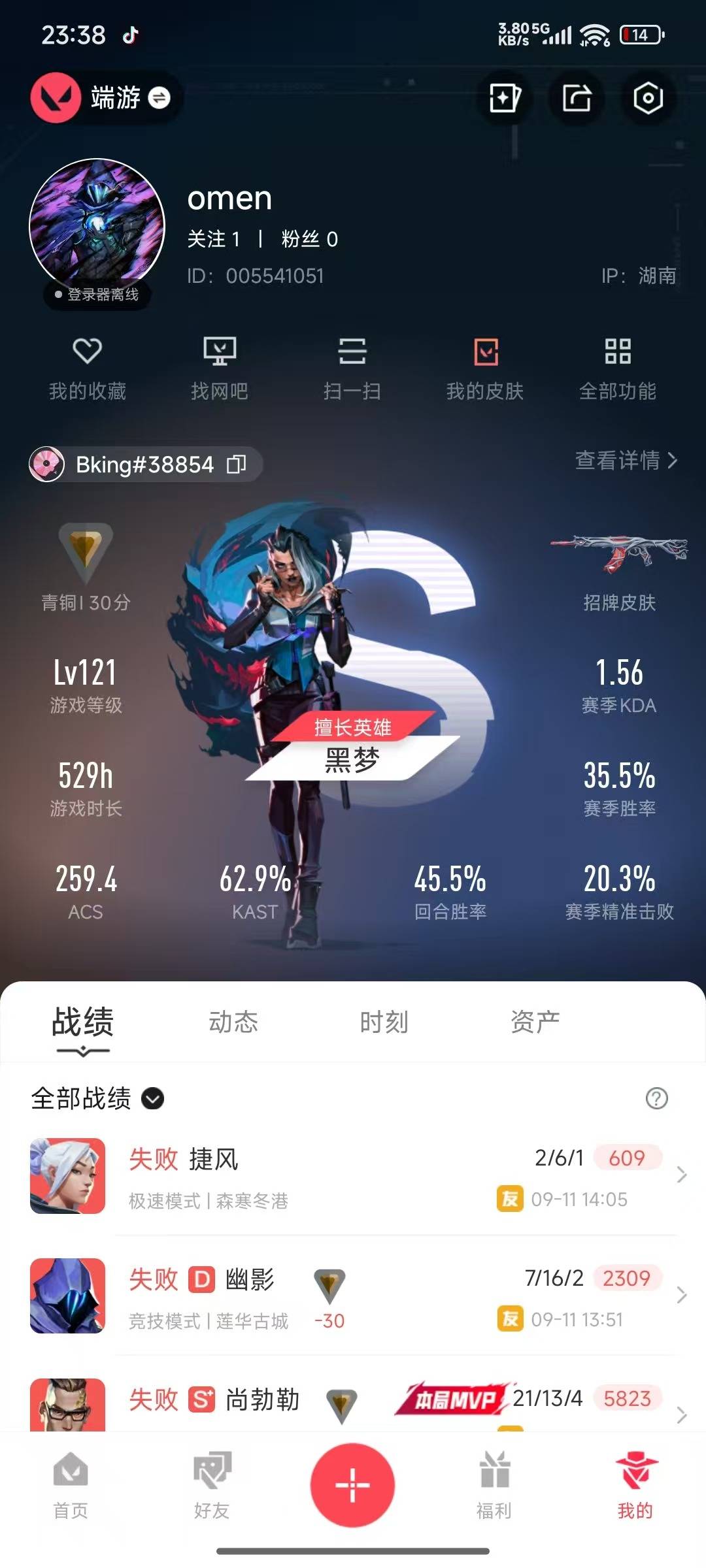 [12311657]7橙皮 5紫皮 17皮肤 27英雄 56卡面 535已用源晶 青铜 优质装备:狂徒-盖亚的复仇,幻影-侦察力量,幻影-洪荒怒焰,狂徒-日冕雄师,幻影-黯夜怪谈,正义-掠影,剥皮小刀,紫金爪刀,影钩,戍卫-紫阙金琅 佩枪皮肤:标配-VCT25xEDG 步枪皮肤:狂徒-噬影者