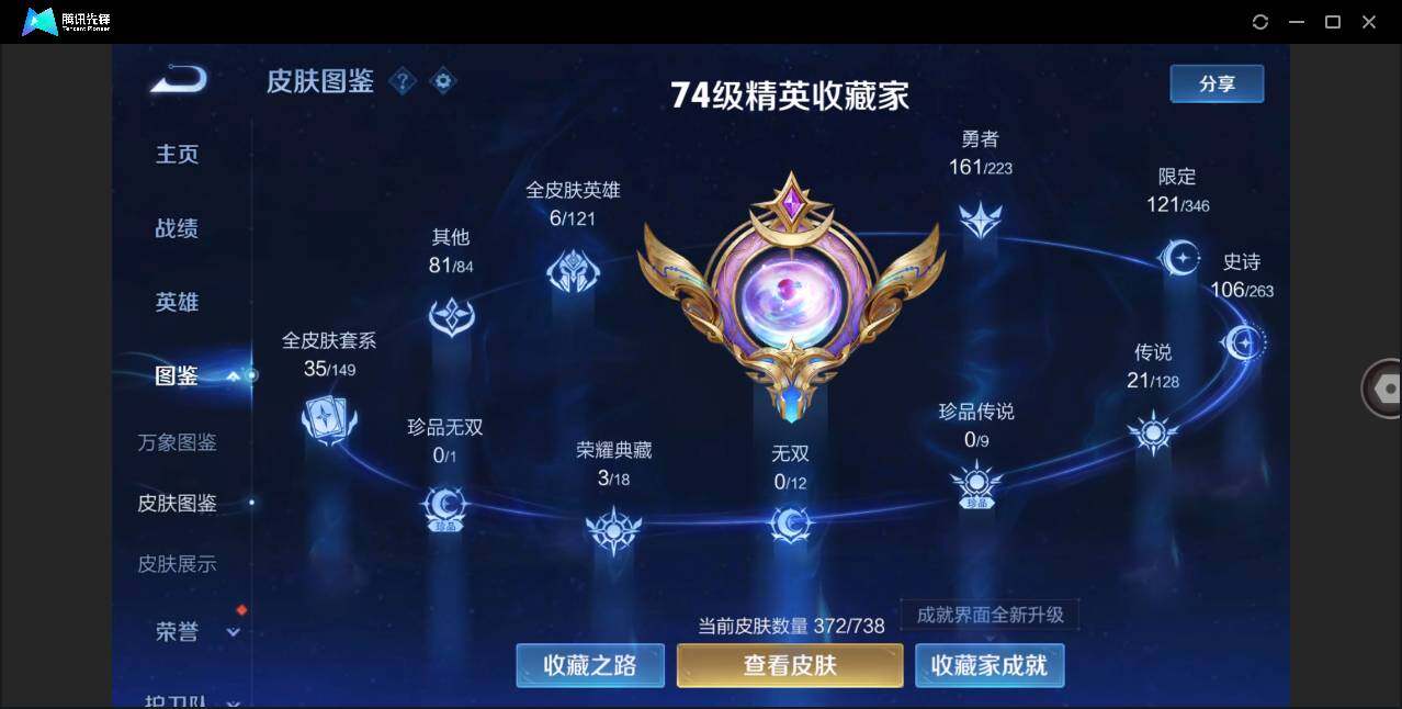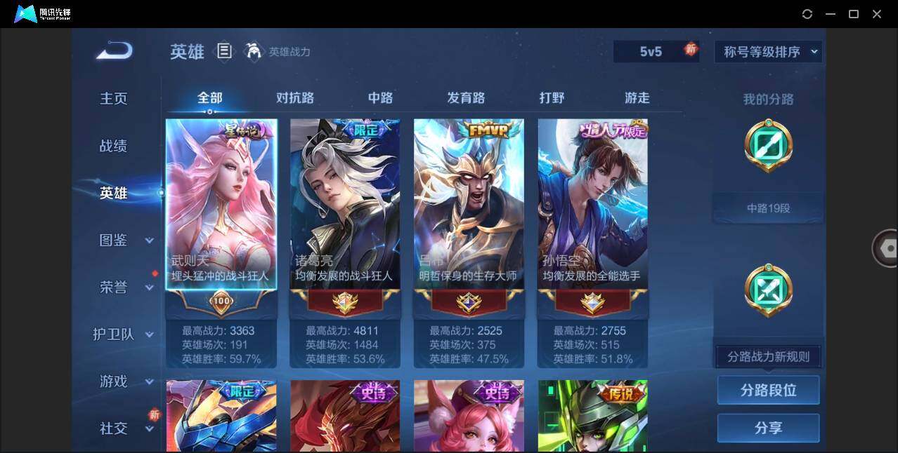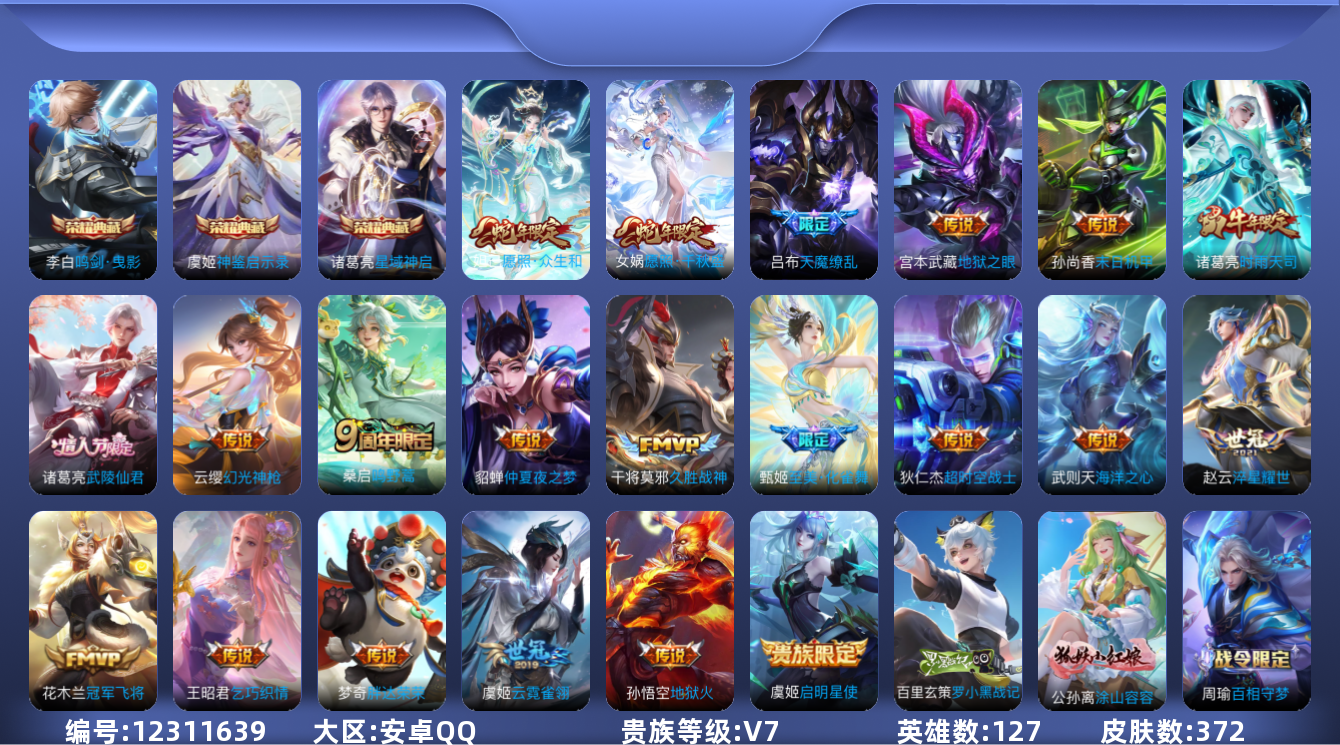 [12311639]【特价急出/详情看图】:安卓Q-V7-最强王者段位-127英雄-372皮肤-3典藏-21传说-106史诗
