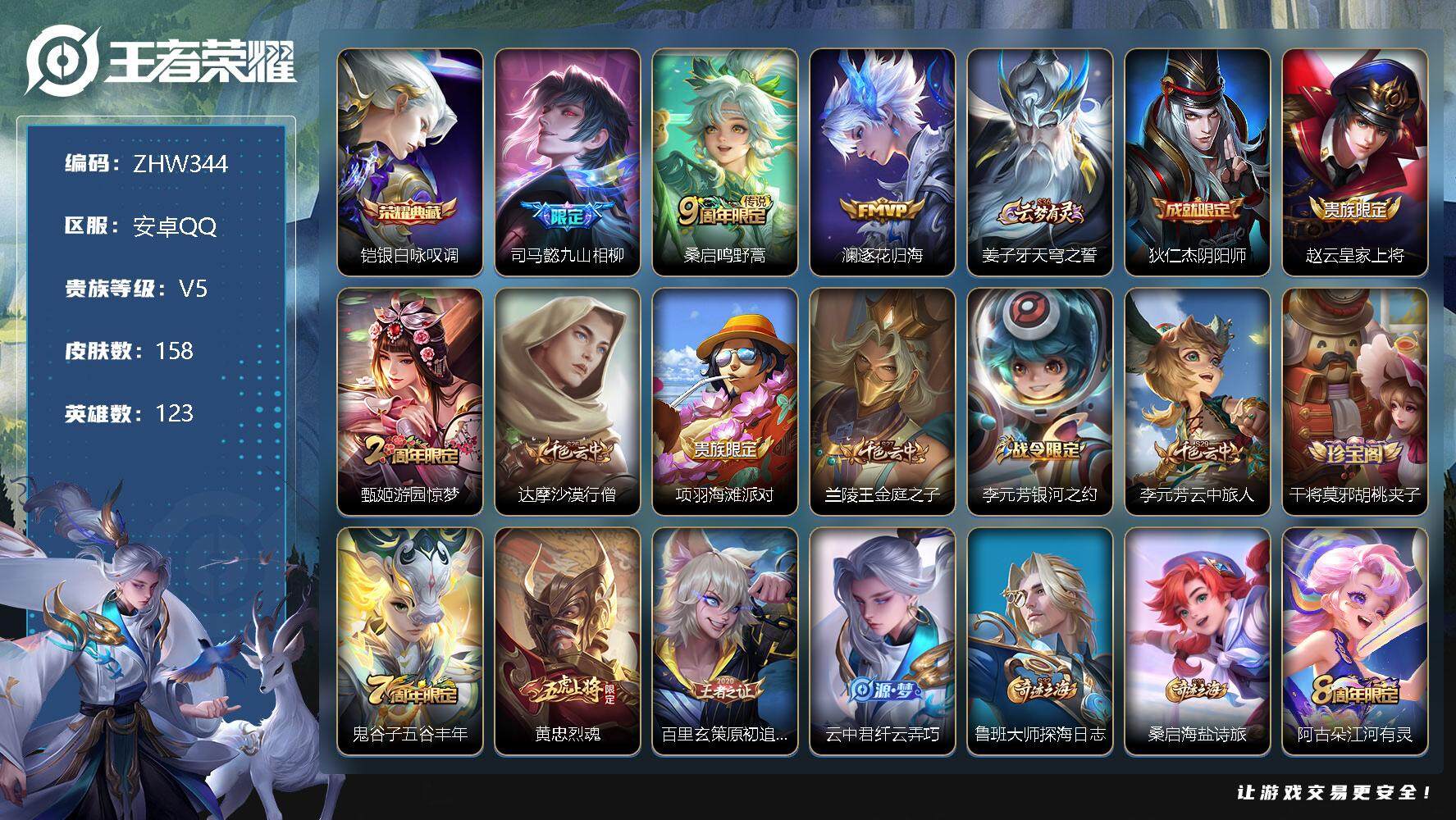 [12311754]打野32段【特价急出/详情看图】:安卓Q-V5-最强王者段位-123英雄-158皮肤-1典藏-3传说-45史诗 【英雄全皮】:司马懿全皮,影全皮 【荣耀典藏】:铠银白咏叹调 【传说皮肤】:司马懿九山相柳,桑启鸣野蒿,澜逐花归海 【限定皮肤】:姜子牙天穹之誓,狄仁杰阴阳师,赵云皇家上将,甄姬游园惊梦,达摩沙漠行僧,项羽海滩派对,兰陵王金庭之子,李元芳银河之约,李元芳云中旅人,干将莫邪胡桃夹子,鬼谷子五谷丰年,黄忠烈魂,百里玄策原初追逐者,云中君纤云弄巧,鲁班大师探海日志,桑启海盐诗旅,阿古朵江河有灵,张良古海寻踪,鬼谷子天穹祈灯,沈梦溪龙舞盛年,刘邦剑破天穹,程咬金群星魔术团 【年限皮肤】:黄忠烈魂 【赛季限定】:达摩沙漠行僧,兰陵王金庭之子,张良古海寻踪,李元芳云中旅人,百里玄策原初追逐者,鲁班大师探海日志,桑启海盐诗旅,鬼谷子天穹祈灯,刘邦剑破天穹,姜子牙天穹之誓 【战令限定】:李元芳银河之约 【史诗皮肤】:鲁班七号电玩小子,赵云皇家上将,赵云未来纪元,貂蝉圣诞恋歌,甄姬冰雪圆舞曲,王昭君偶像歌手,廉颇地狱岩魂,宫本武藏鬼剑武藏,孙尚香水果甜心,墨子龙骑士,墨子金属风暴,曹操幽灵船长,李白千年之狐,张飞乱世虎臣,花木兰水晶猎龙者,刘邦德古拉伯爵,夏侯惇乘风破浪,兰陵王暗隐猎兽者,甄姬游园惊梦,亚瑟心灵战警,雅典娜冰冠公主,百里守约特工魅影,铠曙光守护者,刘禅天才门将,李元芳逐浪之夏,白起星夜王子,阿轲节奏热浪,伽罗箭羽风息,狄仁杰鹰眼统帅,李元芳银河之约,橘右京修罗,黄忠烈魂,百里玄策原初追逐者,云中君纤云弄巧,司马懿暗渊魔法,澜赏金猎手,鬼谷子五谷丰年,阿古朵江河有灵,亚连破空之剑,牛魔星界战将,阿轲化蝶舞,狂铁龙之律动,后羿石田雨龙,周瑜百相守梦,黄忠百相守梦 【其他皮肤】:项羽海滩派对,韩信教廷特使,韩信街头霸王,露娜哥特玫瑰,赵云白执事,赵云忍炎影,宫本武藏未来纪元,安琪拉玩偶对对碰,妲己少女阿狸,典韦黄金武士,张飞五福同心,宫本武藏万象初新,狄仁杰阴阳师,刘备纽约教父,关羽龙腾万里,墨子进击墨子号,钟无艳海滩丽影,狂铁命运角斗场,诸葛亮掌控之力,李白敏锐之力,苏烈坚韧之力,大乔守护之力,明世隐虹云星官,小乔丁香结,哪吒次元突破,狂铁特工战影,刘禅秘密基地,露娜瓷语鉴心,盘古重装意志,典韦铁甲之心,干将莫邪胡桃夹子,达摩沙漠行僧,程咬金无双福将,兰陵王金