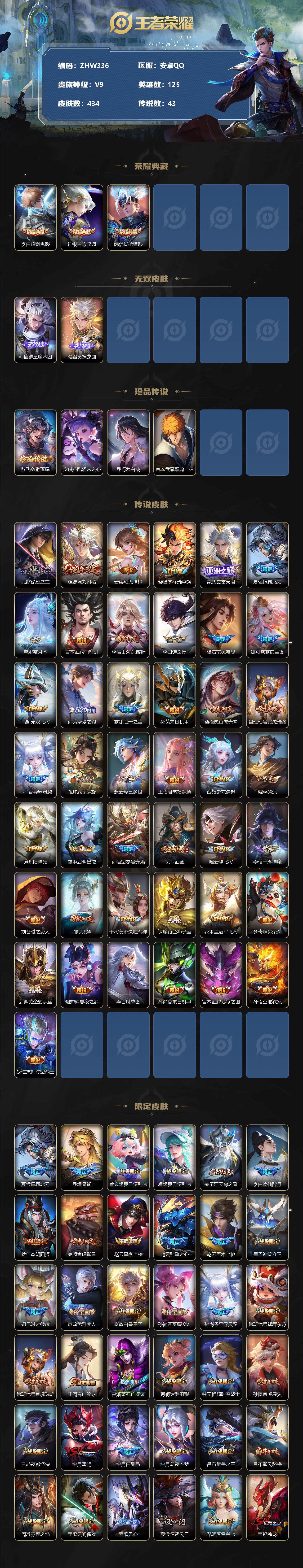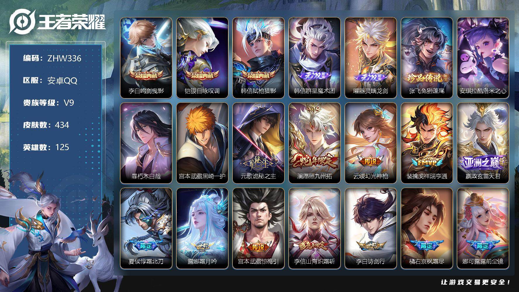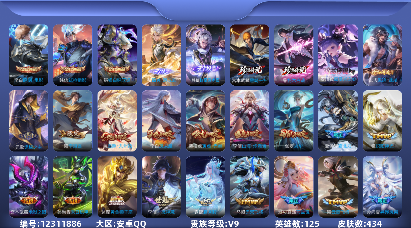[12311886]【特价急出/详情看图】:安卓Q-V9-最强王者段位-125英雄-434皮肤-3典藏-2无双-4珍品传说-43传说-140史诗
