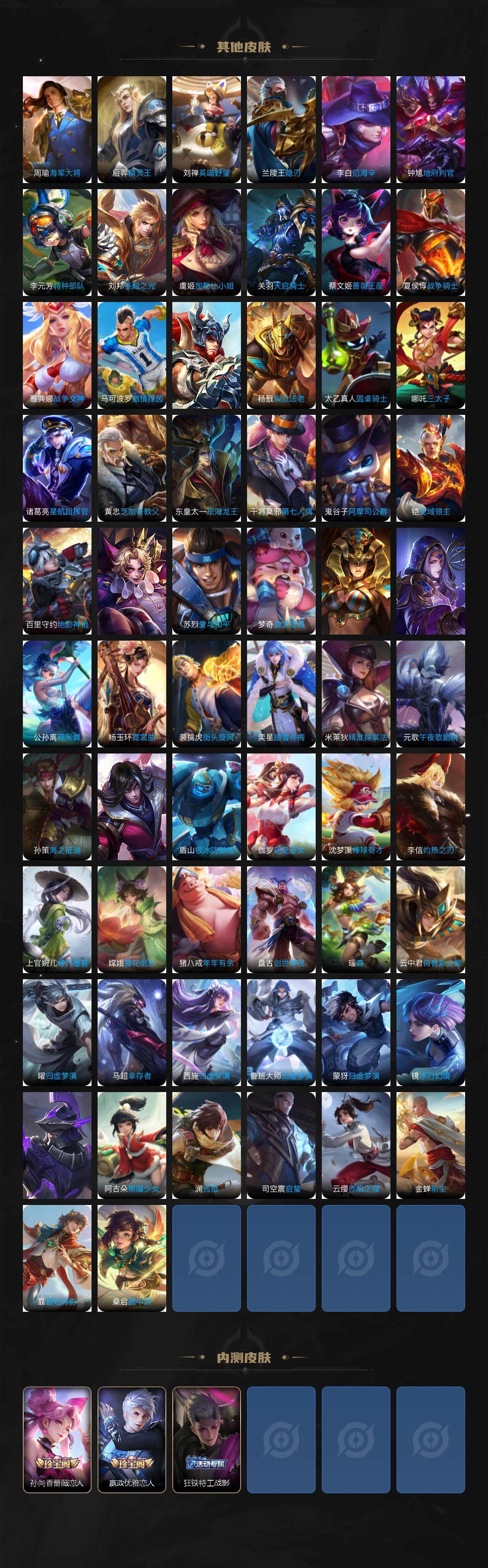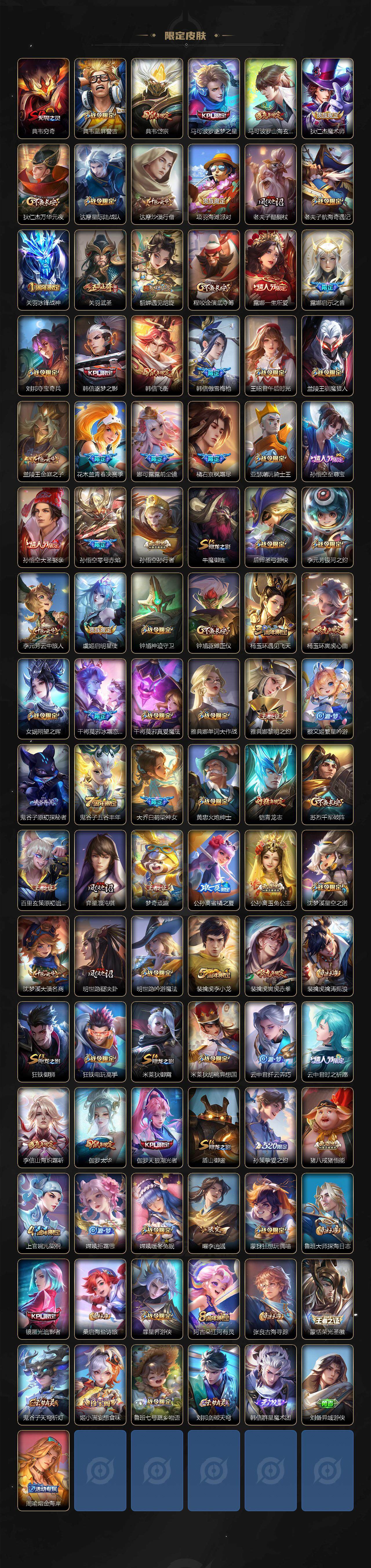【限定皮肤】:夏侯惇霜北刀,暃埋骨钱,蔡文姬夏日便利店,虞姬夏日便利店,姜子牙天穹之誓,李白谪仙醉月,狄仁杰阴阳师,廉颇寅虎御盾,赵云皇家上将,赵云引擎之心,赵云百木心枪,墨子神迹守卫,妲己时之彼端,嬴政优雅恋人,嬴政白昼王子,孙尚香蔷薇恋人,孙尚香异界灵契,鲁班七号狮舞东方,鲁班七号寅虎瑞焰,庄周高山流水,高渐离死亡摇滚,阿轲迷踪丽影,钟无艳超时空战士,孙膑寅虎展翼,白起夜都怪侠,芈月重明,芈月白晶晶,芈月幻夜卜梦,吕布猎兽之王,吕布御风骁将,周瑜赤莲之焰,元歌云间偶戏,元歌无心,夏侯惇朔风刀,甄姬落雪兰心,曹操烛龙,典韦穷奇,典韦蓝屏警告,典韦岱宗,马可波罗逐梦之星,马可波罗山海玄木吟,狄仁杰魔术师,狄仁杰万华元夜,达摩星际陆战队,达摩沙漠行僧,项羽海滩派对,老夫子醍醐杖,老夫子航海奇遇记,关羽冰锋战神,关羽武圣,貂蝉遇见胡旋,程咬金演武夺筹,露娜一生所爱,露娜启示之音,刘邦夺宝奇兵,韩信逐梦之影,韩信飞衡,韩信傲雪梅枪,王昭君午后时光,兰陵王驯魔猎人,兰陵