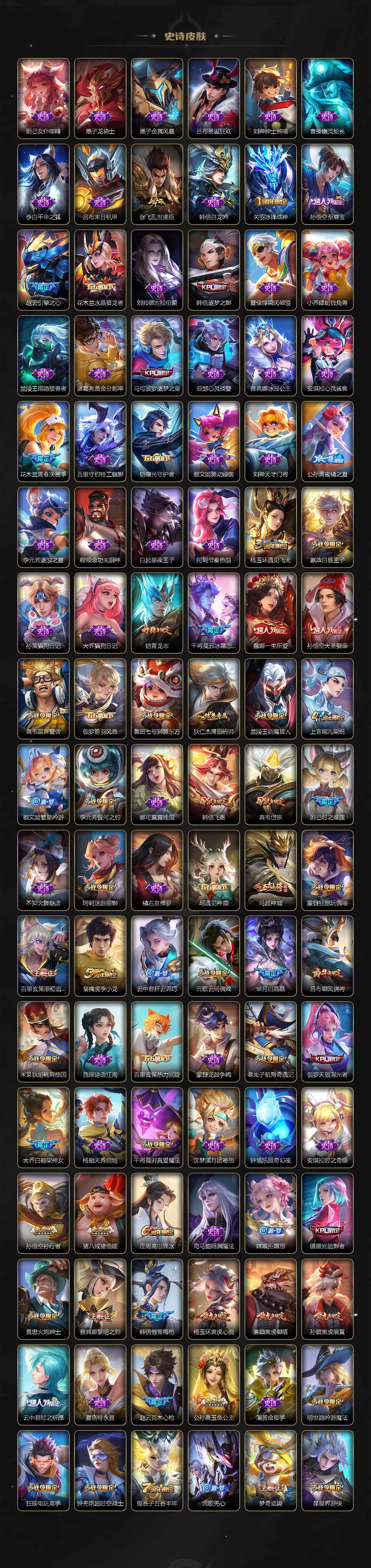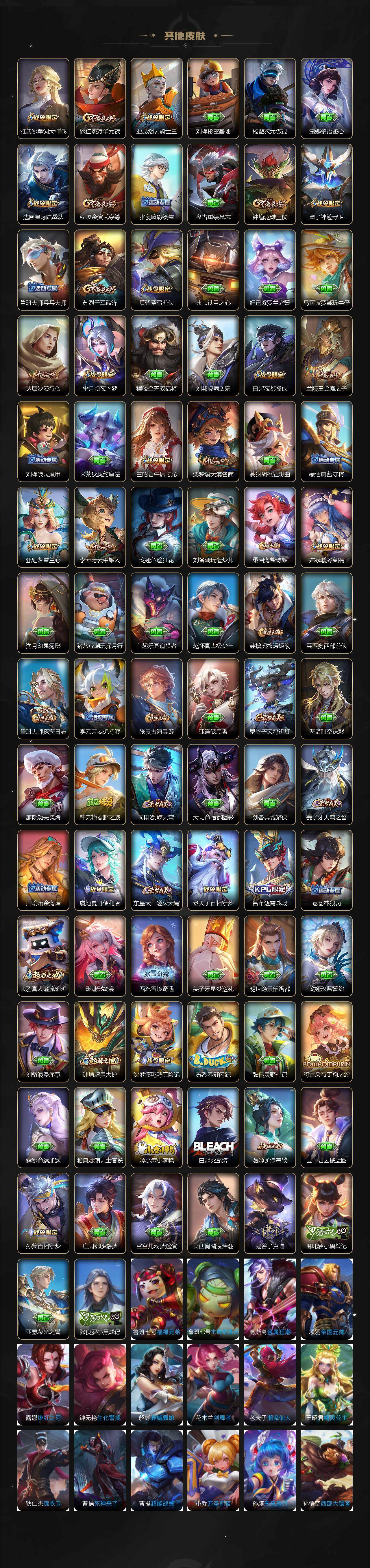 瑶遇见神鹿,娜可露露晚萤,伽罗箭羽风息,李元芳逐浪之夏,不知火舞魅语,大乔猫狗日记,孙策猫狗日记,阿轲节奏热浪,露娜紫霞仙子,诸葛亮黄金分割率,王昭君偶像歌手,韩信白龙吟,项羽苍穹之光,阿轲暗夜猫娘,雅典娜冰冠公主,吕布末日机甲,鲁班七号电玩小子,蒙犽龙鼓争鸣,橘右京修罗,墨子龙骑士,嬴政摇滚巨星,刘禅绅士熊喵,刘禅天才门将,白起星夜王子,安琪拉心灵骇客,安琪拉时之奇旅,程咬金功夫厨神,刘邦德古拉伯爵,兰陵王暗隐猎兽者,曹操幽灵船长,宫本武藏鬼剑武藏,司马懿暗渊魔法,亚瑟心灵战警,钟馗乐园奇幻夜,杨戬天秀·启明,蔡文姬舞动绿茵,廉颇地狱岩魂,西施诗语江南,小乔缤纷独角兽,夏侯惇乘风破浪,花木兰水晶猎龙者,铠曙光守护者,百里玄策热力回旋,墨子金属风暴,百里玄策原初追逐者,吕布圣诞狂欢,貂蝉圣诞恋歌,百里守约特工魅影,嬴政暗夜贵公子,嫦娥拒霜思,雅典娜黎明之约,李白千年之狐,夏洛特永昼,澜赏金猎手,李白谪仙醉月,赵怀真器灵·浮梦炉
