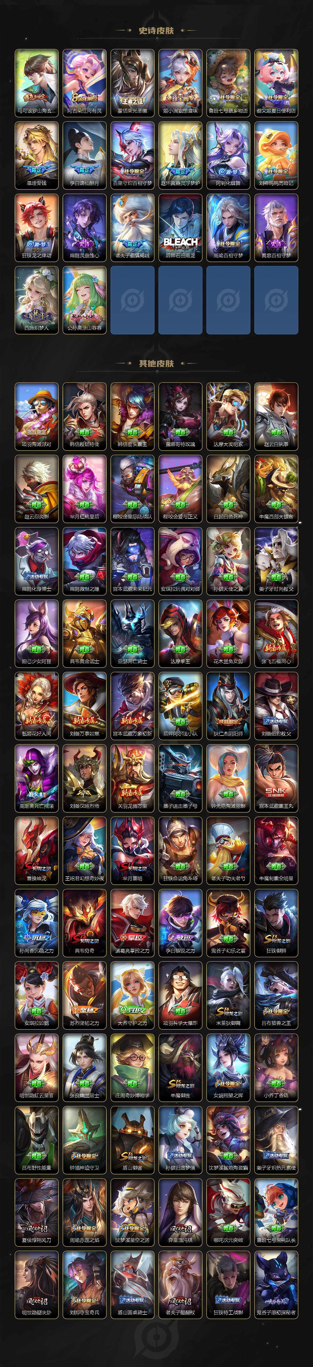 【英雄全皮】:嬴政全皮,元歌全皮,宫本武藏全皮,露娜全皮,刘邦全皮,韩信全皮,娜可露露全皮,橘右京全皮,钟馗全皮,鬼谷子全皮,狂铁全皮,李信全皮,蒙恬全皮,暃全皮,空空儿全皮,影全皮