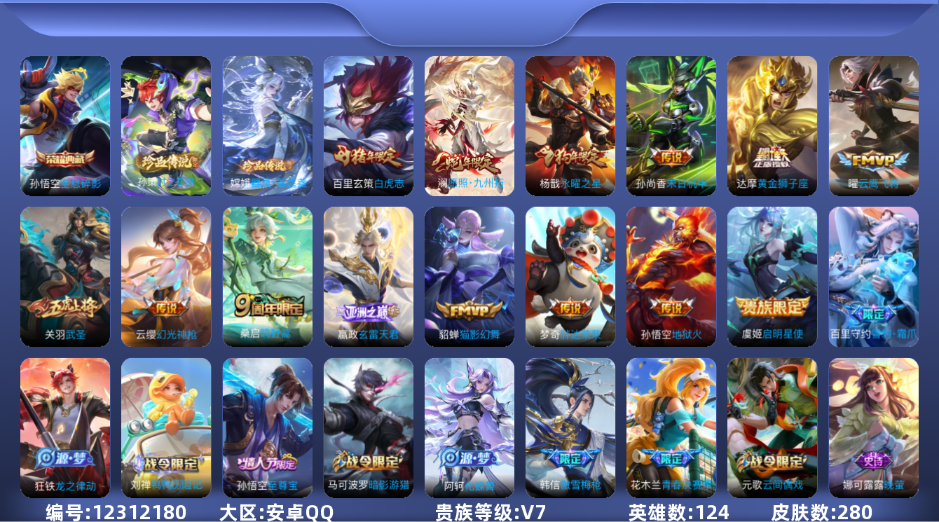 [12312180]【商品标题】:安卓Q-V7-最强王者段位-124英雄-280皮肤-1典藏-0珍品无双-0无双-2珍品传说-14传说-81史诗