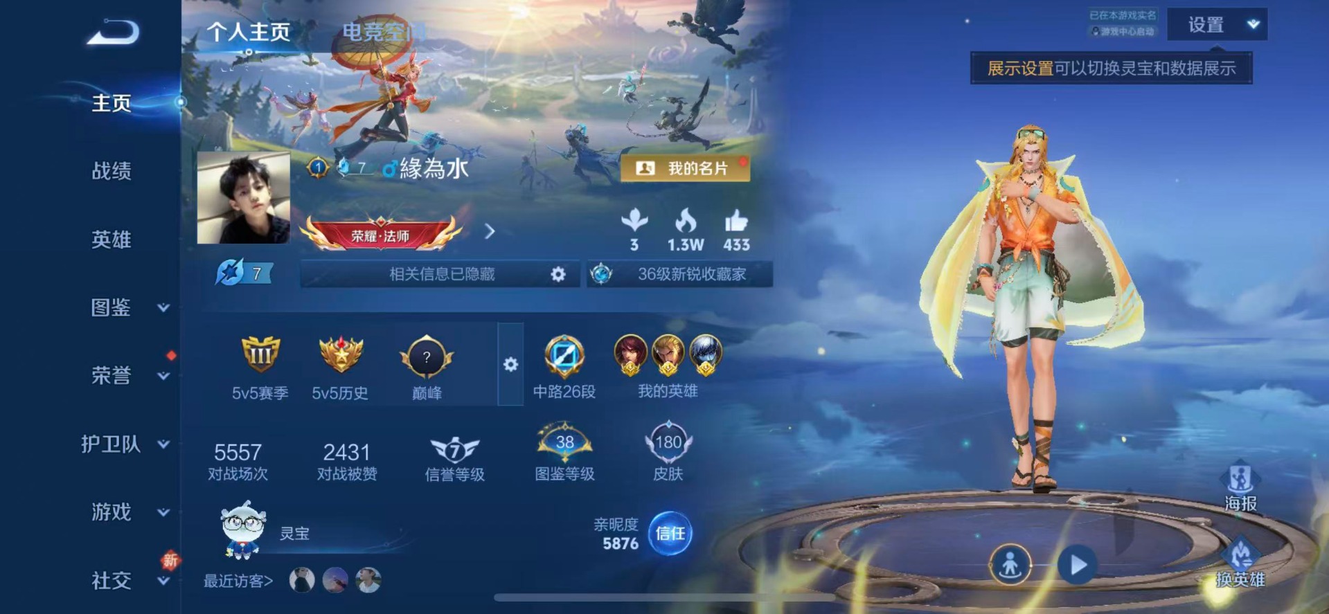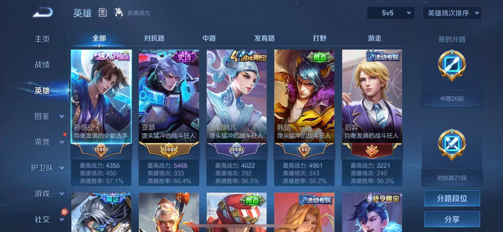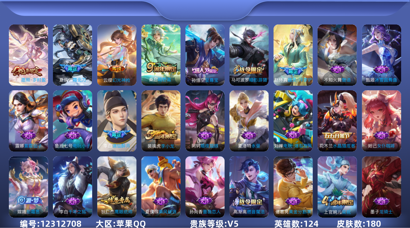 [12312708]V5 4传说 124英雄 180皮肤 可修改实名 传说皮:幻光神枪 珍宝阁皮:优雅恋人,蔷薇恋人 限定皮:愿照·岁时盈(虞姬年限),逐霄战戟,鸣野蒿,夏侯惇霜北刀,至尊宝,高山流水,梁祝,李小龙 史诗皮:器灵·浮梦炉,星界战将,谪仙醉月,蒙犽顽岩魄,蔬乡物语(鲁班七号),紫霞仙子,电玩小子(小书包),黄金分割率,千年之狐,永昼,魅语,高渐离燃音魔法,蒙恬荣光圣徽,冰冠公主,偶像歌手,电玩·爆裂旋风,暗夜猫娘,龙骑士(小龙虾),猫狗日记-孙策,乱世虎臣,节奏热浪,女仆咖啡,摇滚巨星,水果甜心,绅士熊喵,天才门将,功夫厨神,德古拉伯爵,暗隐猎兽者,鬼剑武藏,心灵战警,拒霜思,乘风破浪,水晶猎龙者,箭羽风息,金属风暴,圣诞狂欢,鹰眼统帅