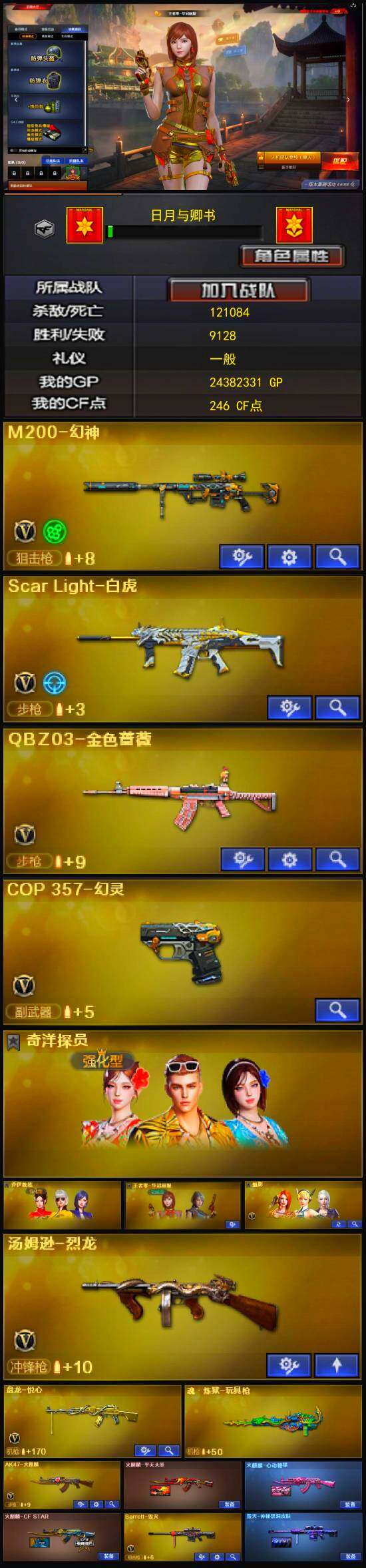 【热门武器】:QBZ03-金色蔷薇,Scar Light-白虎,M200-幻神,汤姆逊-烈龙,COP 357-幻灵,沙鹰-修罗*2,金刚伞