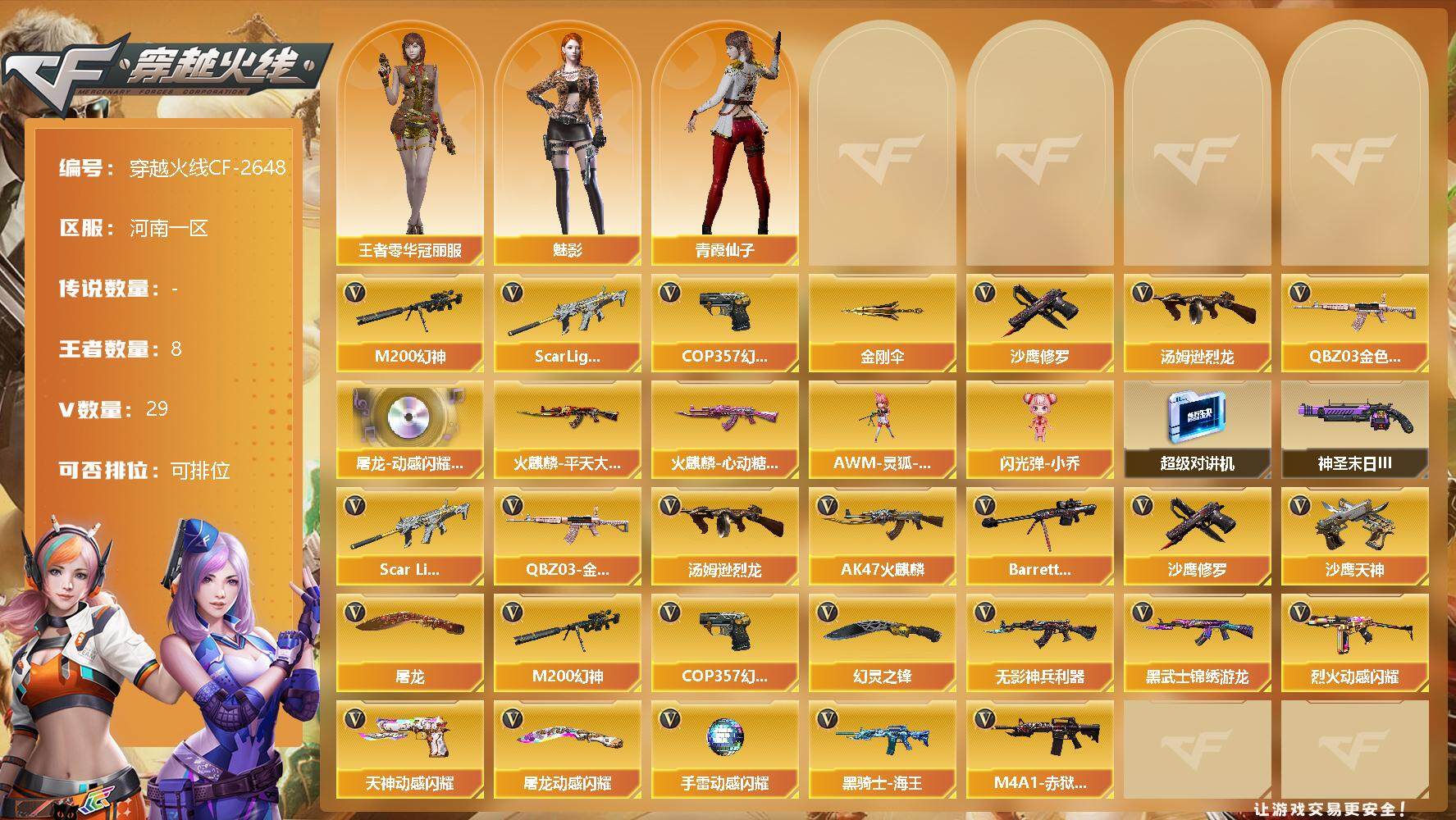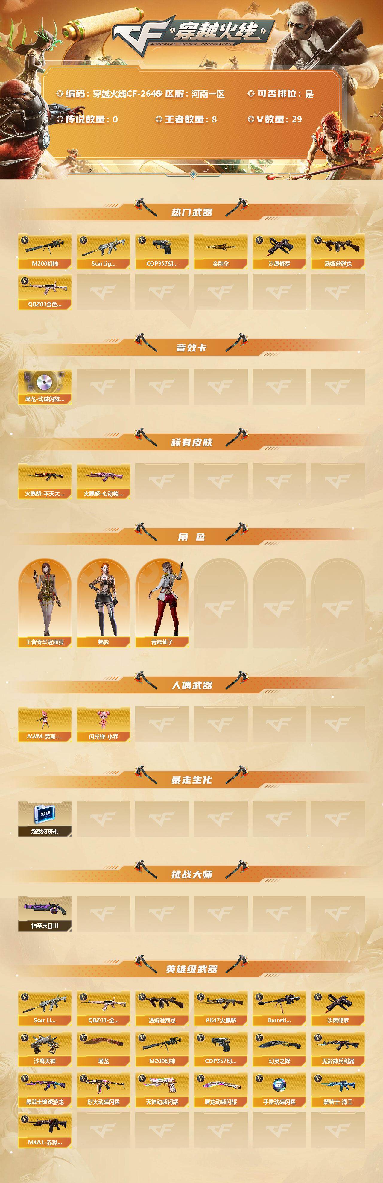 [12312863]【商品标题】:河南一区-29V-8王者-0炫金 【热门武器】:QBZ03-金色蔷薇,Scar Light-白虎,M200-幻神,汤姆逊-烈龙,COP 357-幻灵,沙鹰-修罗*2,金刚伞 【音效卡】:屠龙-动感闪耀 音效卡 【稀有皮肤】:火麒麟-平天大圣,火麒麟-心动糖果 【角色】:王者零-华冠丽服,魅影,青霞仙子 【人偶武器】:AWM-灵狐-15周年嘉年华,闪光弹-小乔 【暴走生化】:超级对讲机 【挑战大师】:神圣爆裂者-末日III 【英雄级武器】:COP 357-幻灵,幻灵之锋,烈火-动感闪耀,天神-动感闪耀,屠龙-动感闪耀,手雷-动感闪耀,QBZ03-金色蔷薇,Scar Light-白虎,无影-神兵利器,汤姆逊-烈龙,AK47-火麒麟,Barrett-毁灭,M200-幻神,黑武士-锦绣游龙,黑骑士-海王,M4A1-赤狱骑士,沙鹰-天神,沙鹰-修罗*2,屠龙 【特殊枪械】:1白虎,1烈龙